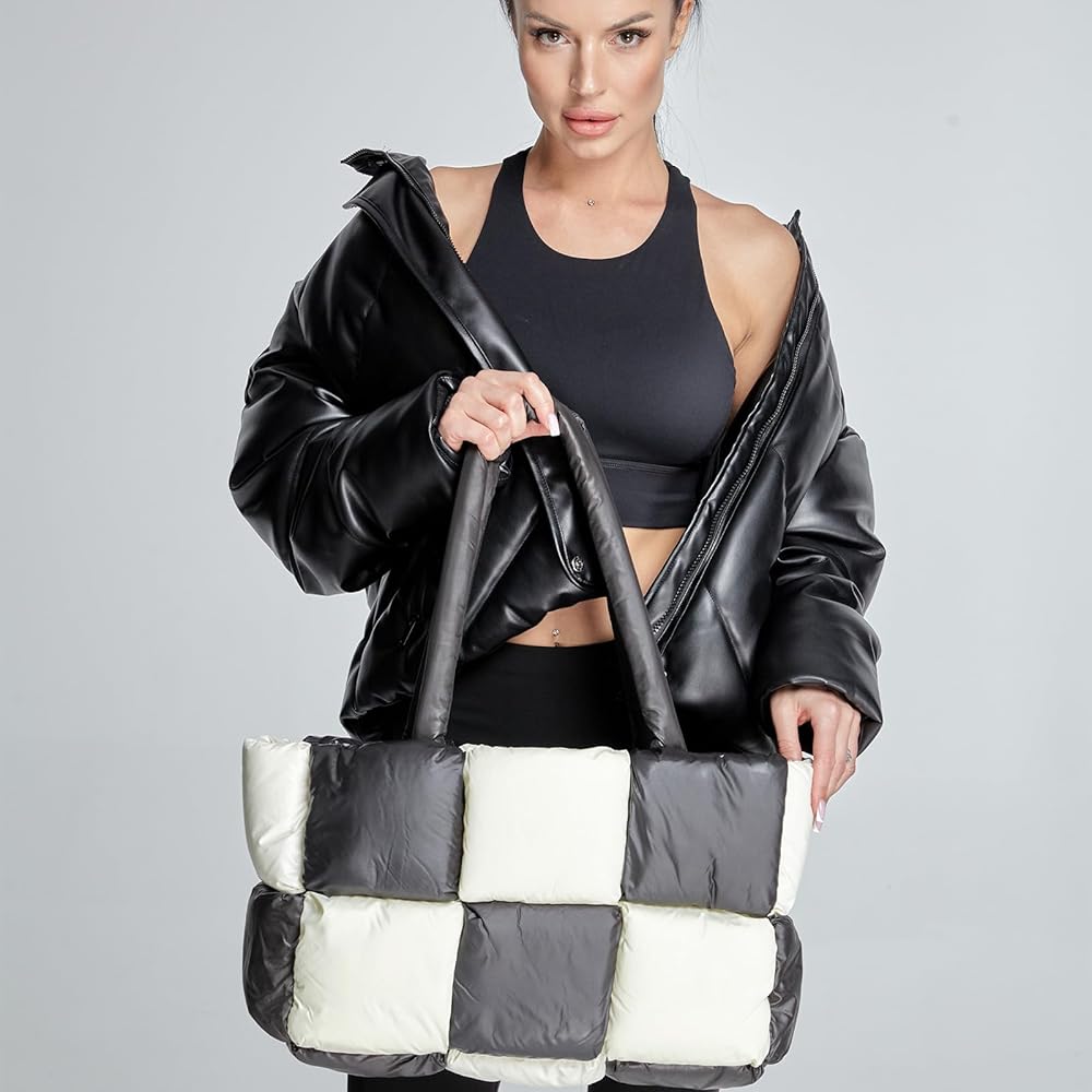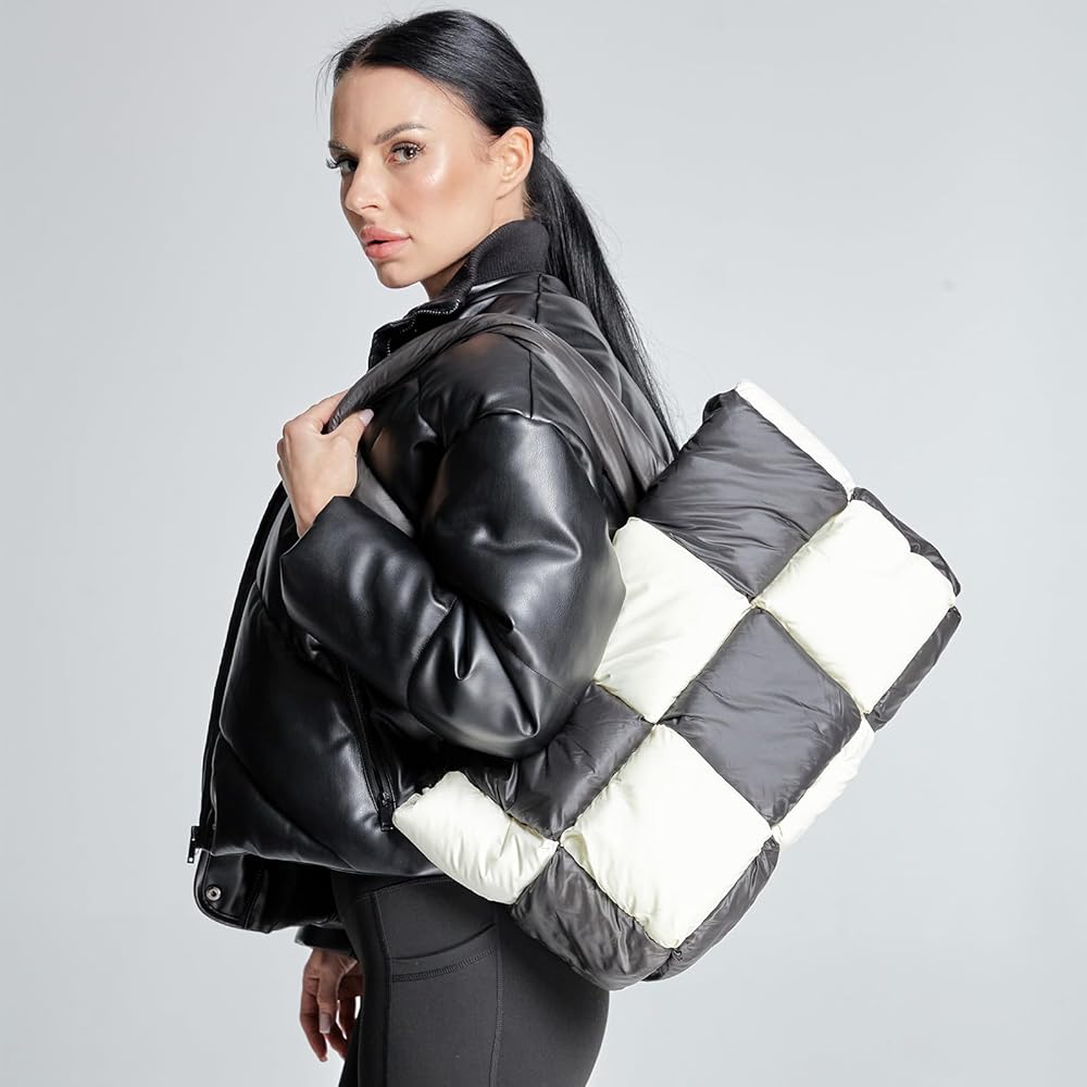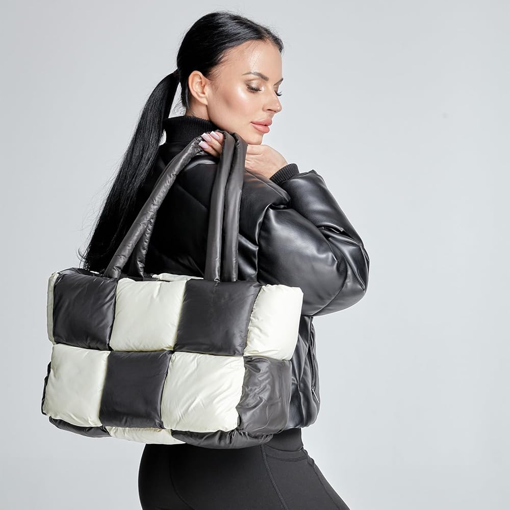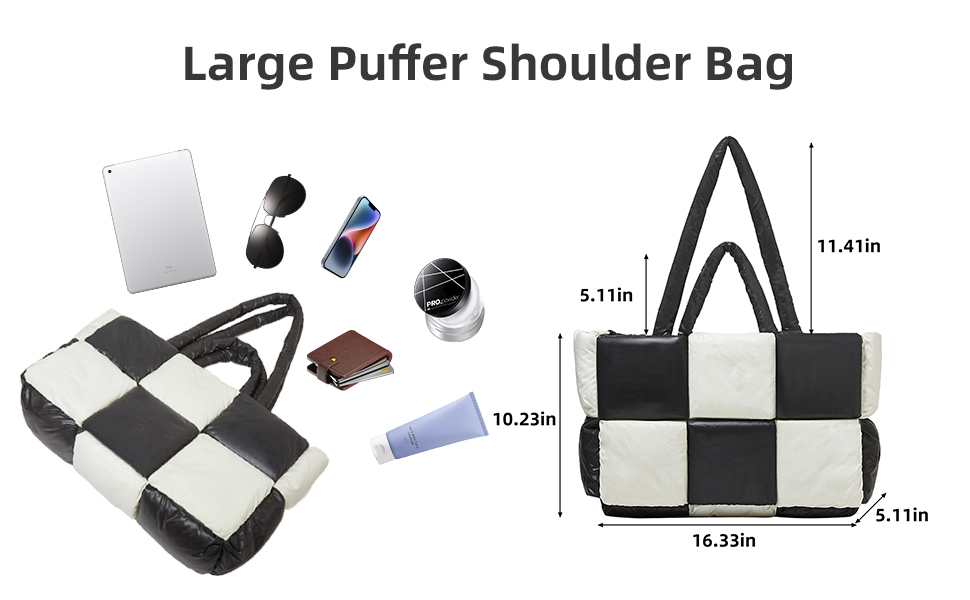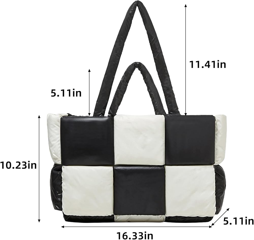 المقاس: 16.32 انش × 5.12 انش × 10.25 انش (الطول × العرض × الارتفاع)، يمكن لحقيبة الكتف المنتفخة البسيطة ذات المربعات حمل ضرورياتك اليومية مثل المحفظة والمكياج والهاتف والايباد والكتب وما إلى ذلك.