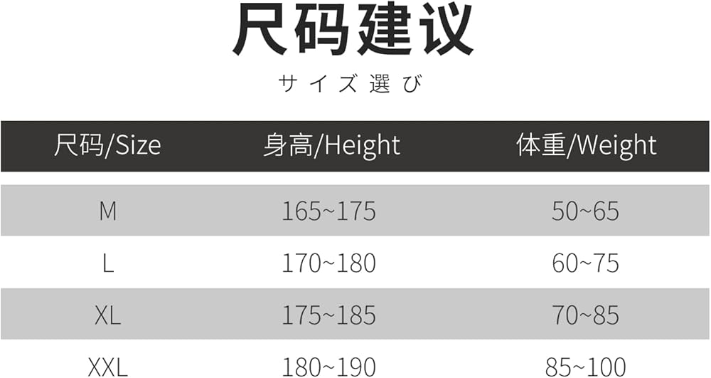 - 5. الأبعاد المرجعية: مقاس M، الارتفاع 165 ~ 175 سم، الوزن 50 ~ 65 كجم، مقاس L، الارتفاع 170 ~ 180 سم، الوزن 60 ~ 75 كجم، مقاس XL، الارتفاع 175 ~ 185 سم، الوزن 70 ~ 85 كجم، مقاس XXL، الارتفاع 180 ~ 190 سم، الوزن 85 ~ 100 كجم