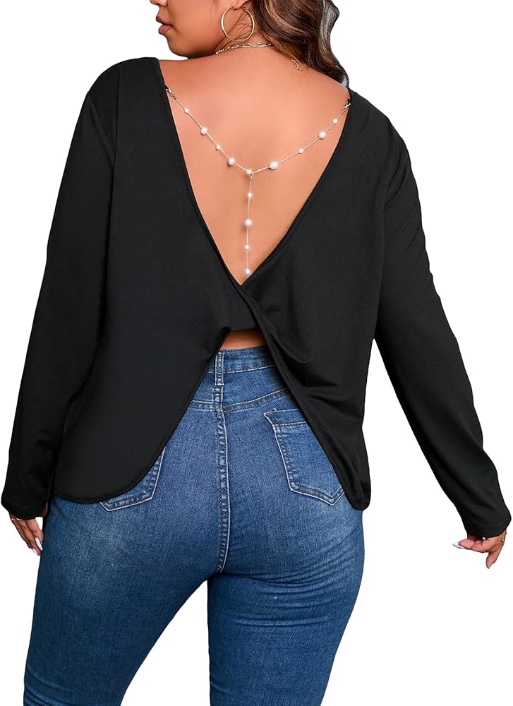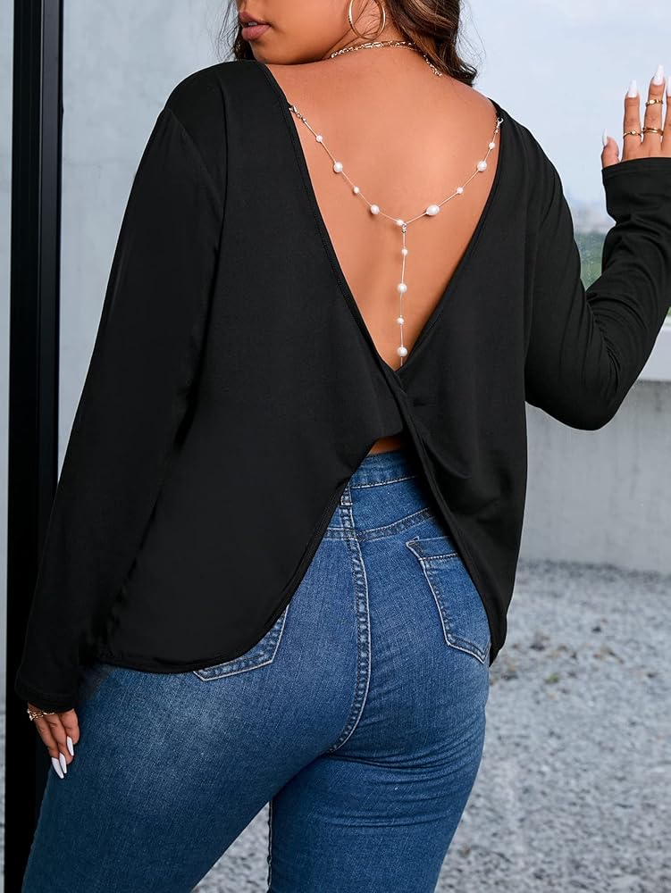 تي شيرت نسائي SOLY HUX مقاس كبير بدون ظهر وأكمام طويلة وسلسلة لؤلؤية