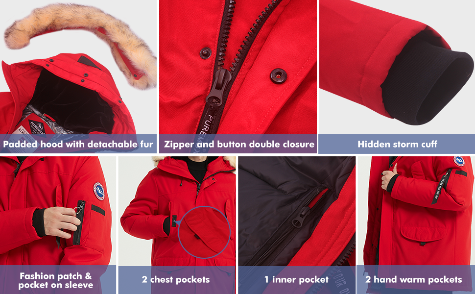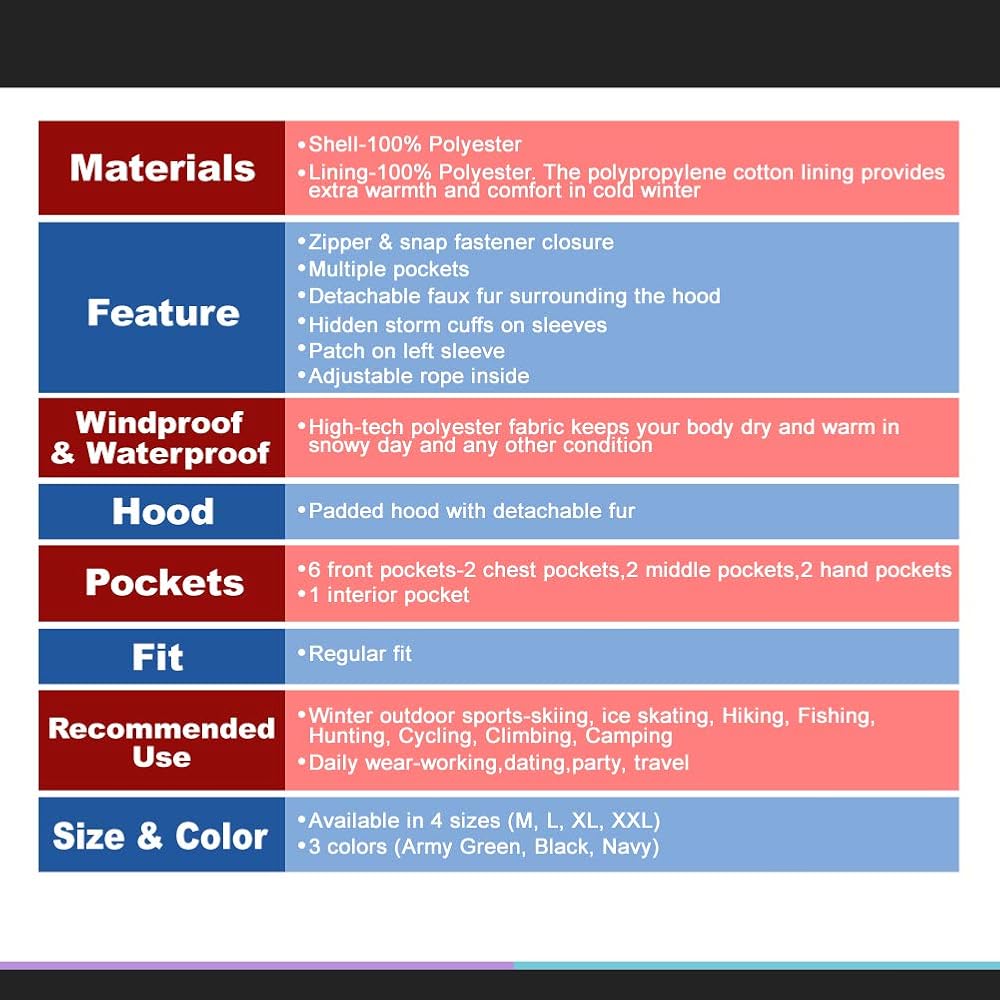معطف باركا كلاسيكي: تم تصميم معطف باركا بمقاس عادي؛ رقعة على الكم الأيسر؛ إغلاق بسحاب وزر؛ جيوب متعددة معزولة (2 جيب على الصدر، 2 جيب يدوي من الصوف، 1 جيب داخلي بسحاب، 2 جيب للقلم على الكم الأيسر)؛ فرو صناعي قابل للفصل؛ أصفاد عاصفة مخفية للحفاظ على الحرارة ومنع تدفق الرياح الباردة. السترة الشتوية مناسبة للعمل والمواعدة. كما أنه مثالي للرياضات الخارجية، مثل التزلج واستكشاف الجبال والمغامرة والمشي لمسافات طويلة وصيد الأسماك والتخييم وما إلى ذلك.