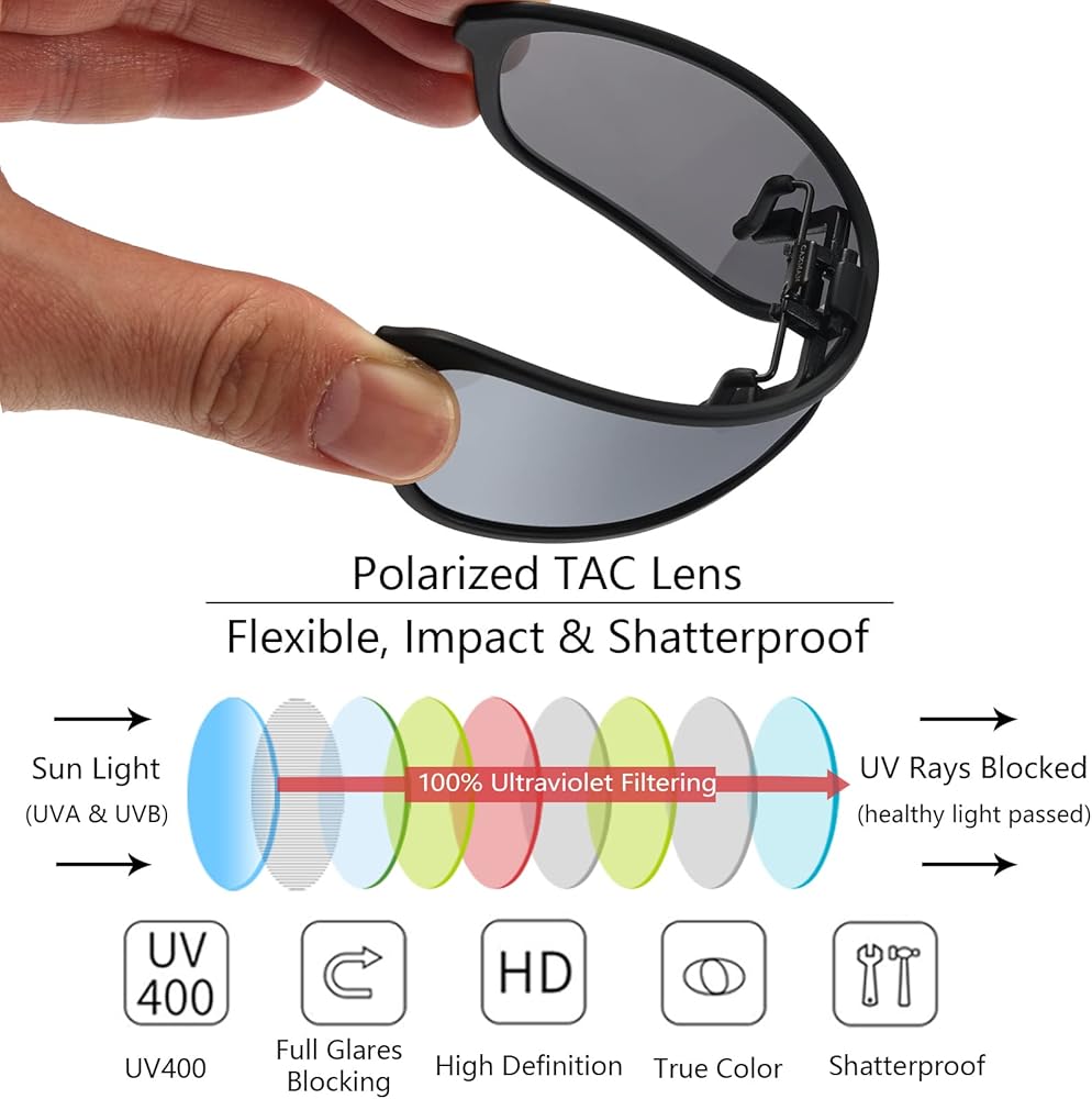 رؤية واضحة وحماية كاملة ضد الأشعة فوق البنفسجية - العدسات المستقطبة تقلل الوهج والانعكاسات من الطريق والأنهار بشكل فعال؛ رائع للقيادة أو الصيد، رؤية أكثر وضوحًا وقيادة أكثر أمانًا، حماية 100% من الأشعة فوق البنفسجية (UVA وUVB)