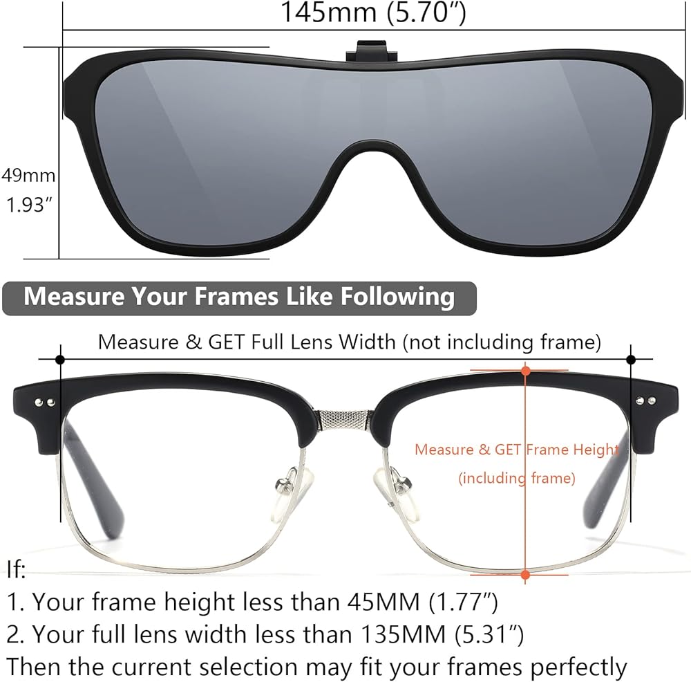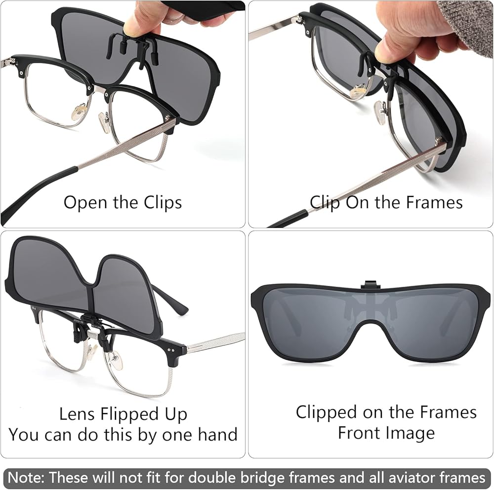 تناسب معظم الإطارات - الحقيقة هي أنه لا يوجد مشبك واحد على النظارات الشمسية يمكن أن يناسب جميع الإطارات، كنا نحاول أن نجعلها تناسب معظم الإطارات، مثل النظارات ذات الإطارات الكاملة العادية (البلاستيك أو المعدن أو حتى الإطارات السلكية)، ولكن ليس للجميع إطارات بدون إطار وليس لجميع إطارات الجسر المزدوج
