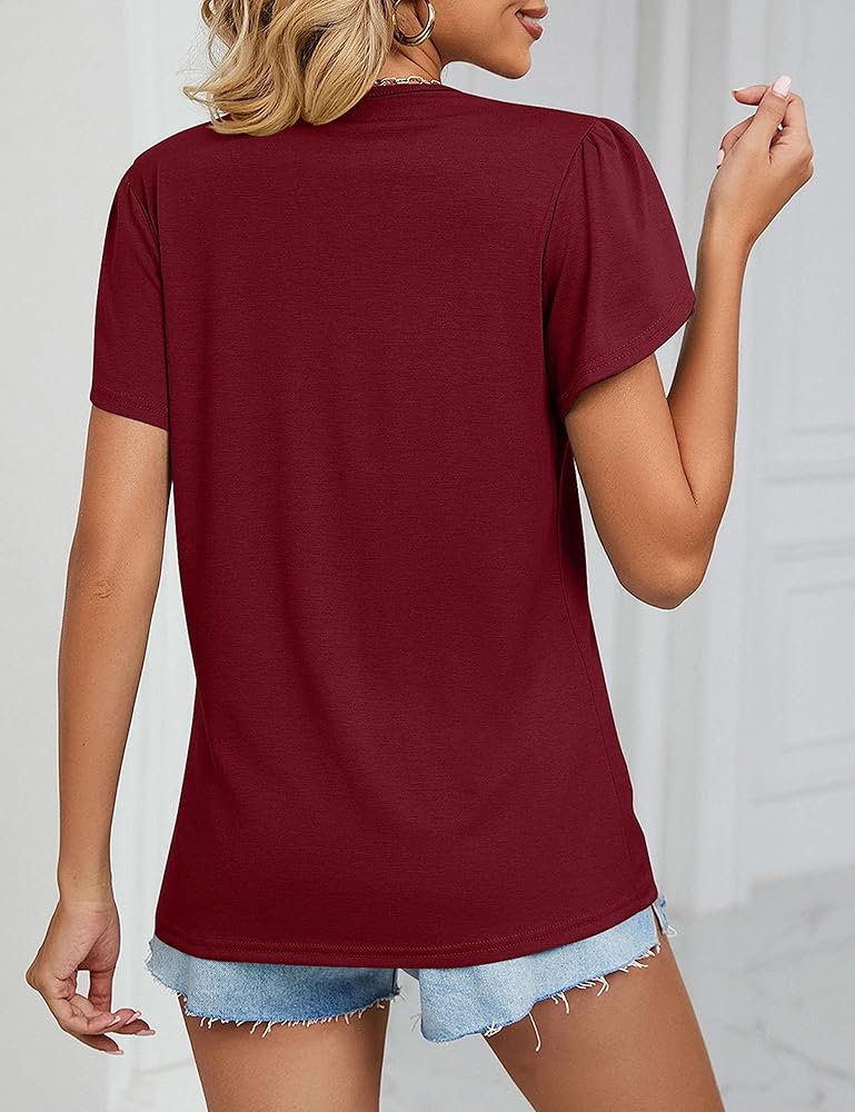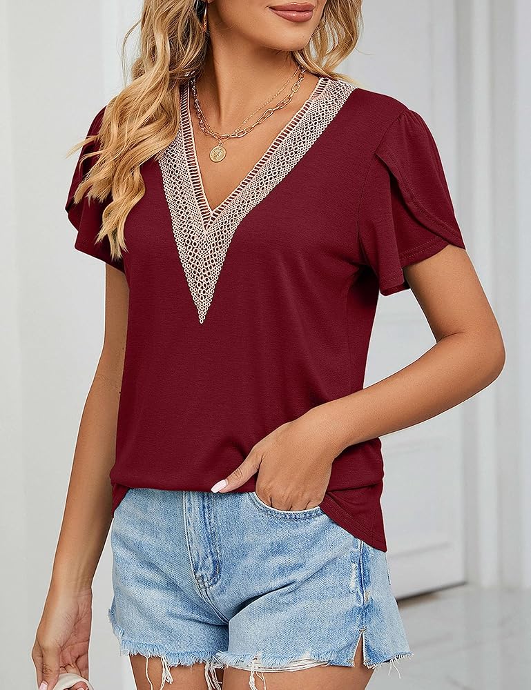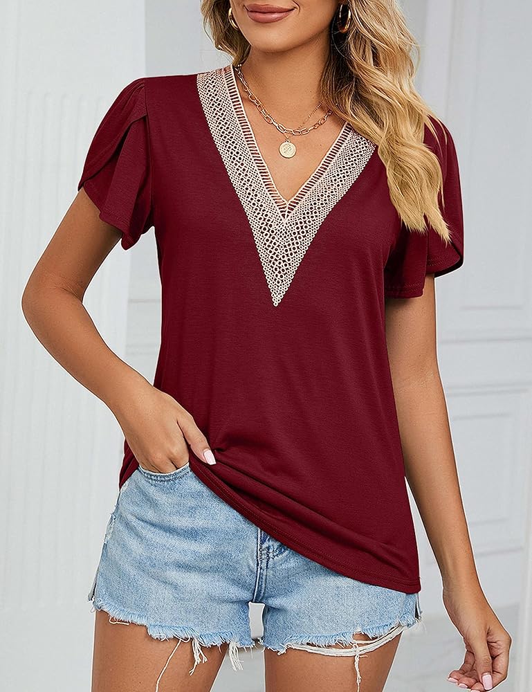 بلوزة نسائية صيفية بأكمام قصيرة من Amoretu، بلوزة دانتيل برقبة على شكل حرف V، قمصان عمل