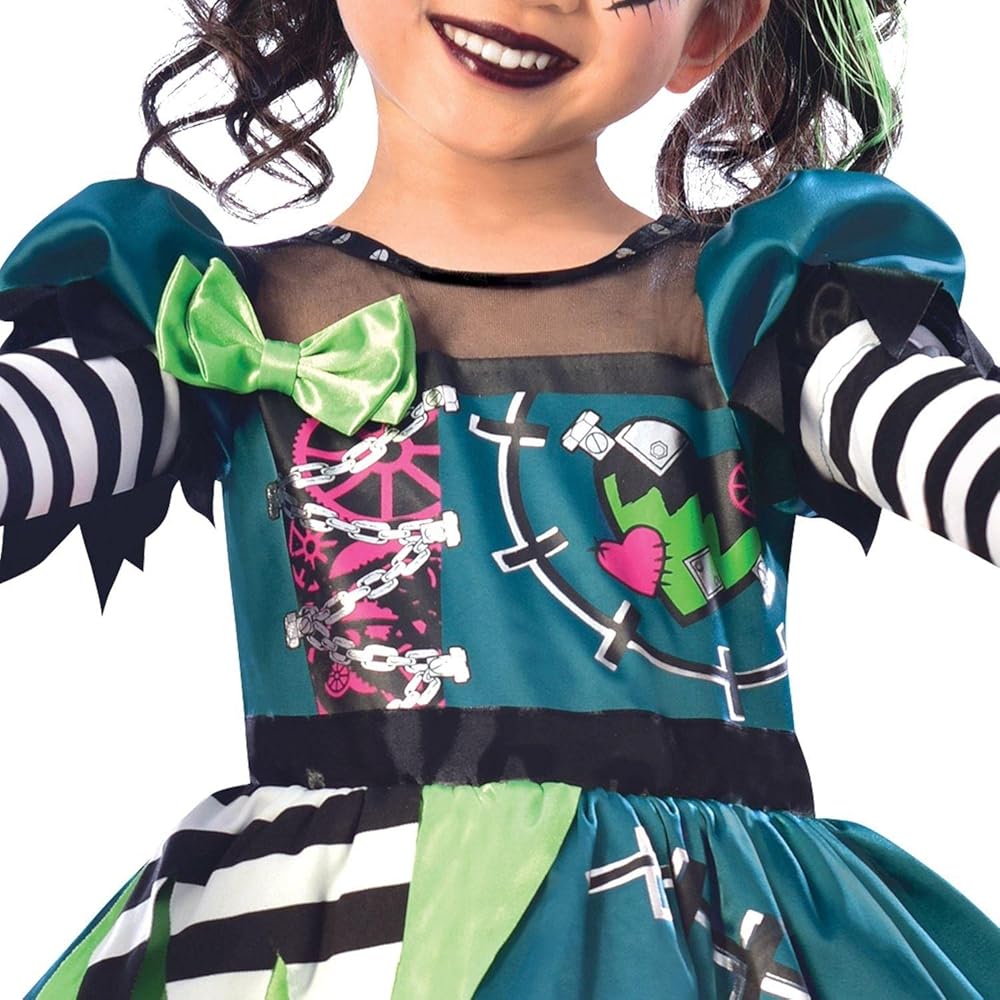 - يتضمن الزي فستانًا أخضر فاتح وفيروزي مع أكمام مخططة باللونين الأسود والأبيض. وعصابة رأس مع رأس فرانكنشتاين.