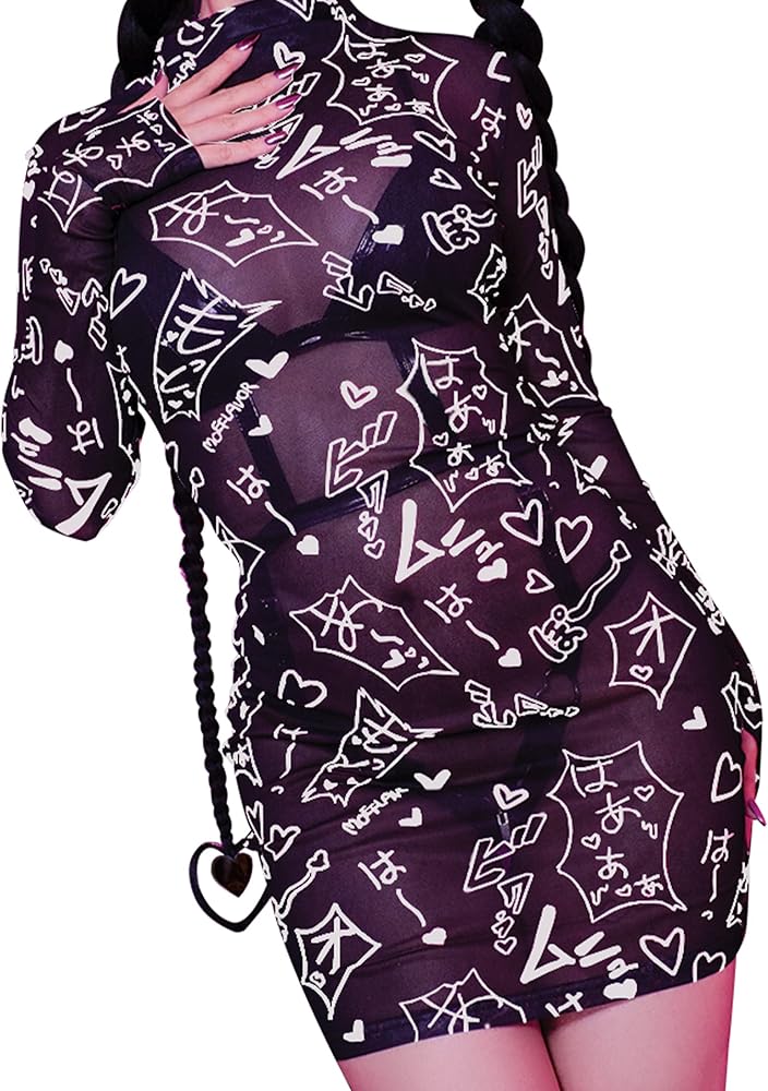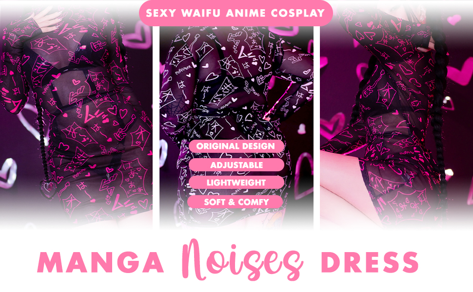 زي مرح ومثير - اظهري بمظهر مثير وجذاب تمامًا في زي فستان MOEFLAVOR المثير الشبكي الأنيمي Manga Noises hentai sfx المطبوع بذيئة. يتميز بياقة عالية وطبعات مرحة لأكثر من 18 عامًا، وهو مزيج مثالي من الرقي والمرح.