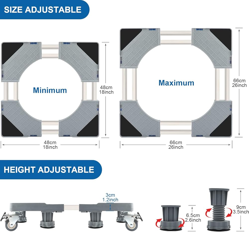【حامل قاعدة قابل للتعديل】يمكن تعديل طول وعرض حامل الثلاجة الصغير من 45.72 سم إلى 66.04 سم؛ كما أن حامل الغسيل قابل للتعديل من جميع الجوانب، حتى تتمكن من تخصيصه بين الحد الأدنى لأطوال مختلفة للاستخدامات.