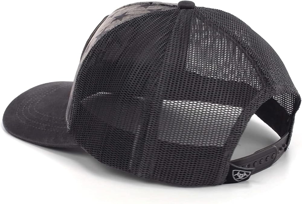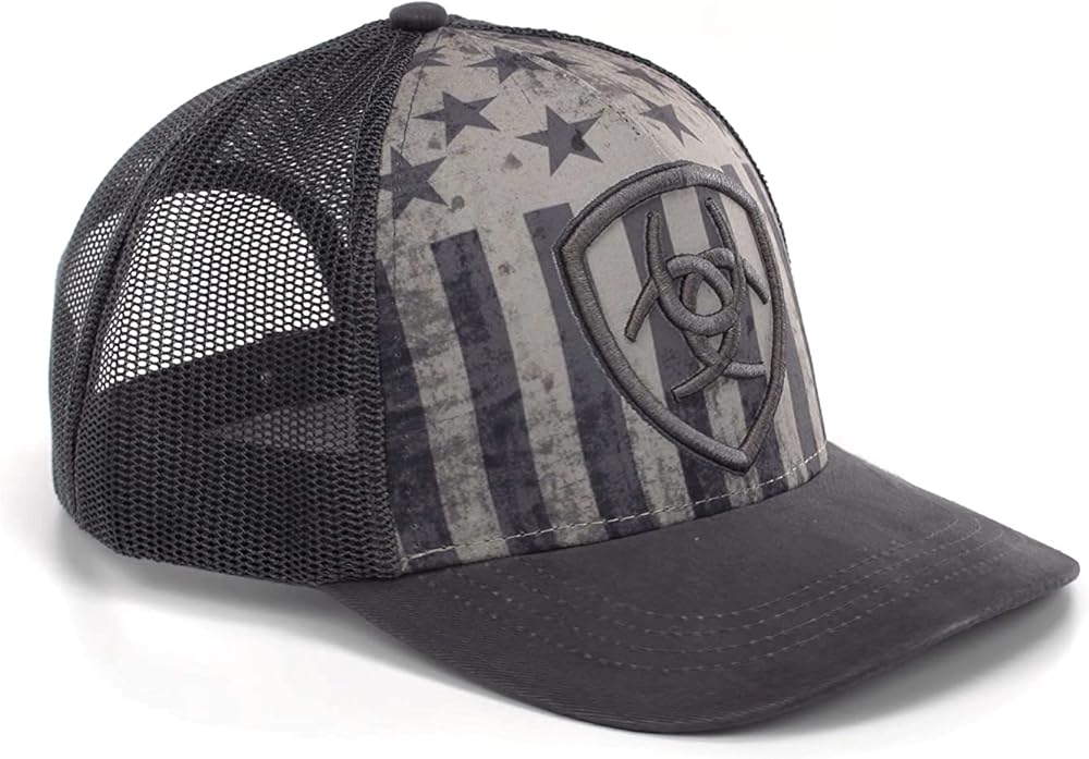 Nice Ariat mens cap by M&F Western Products. Front panel has a muted grey USA flag and a large embroidered Ariat shield. Grey bill and grey mesh back with snap back closure.