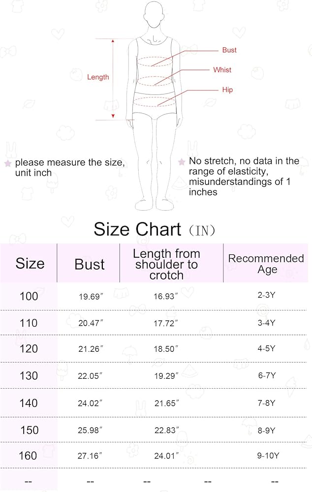 • ملاحظات----- العمر من 2 إلى 10 سنوات. يرجى التحقق من قياسات المقاس قبل الطلب لضمان المقاس المناسب. لا تمزجها مع الملابس الخفيفة أو التنظيف الجاف.