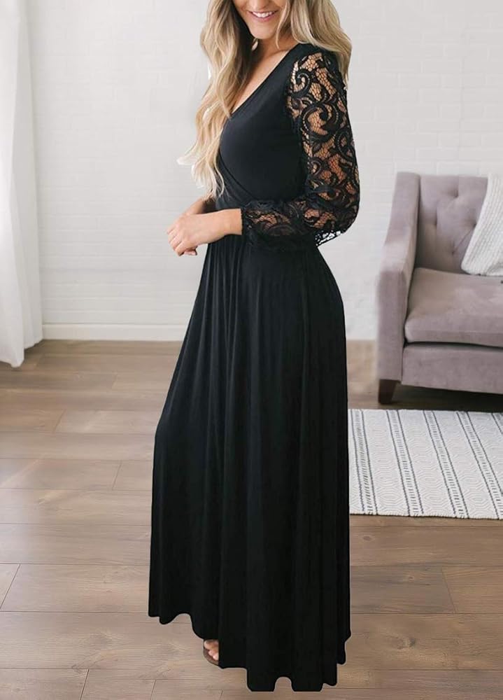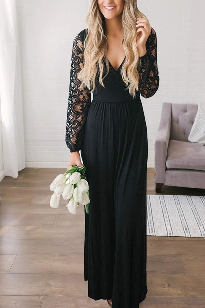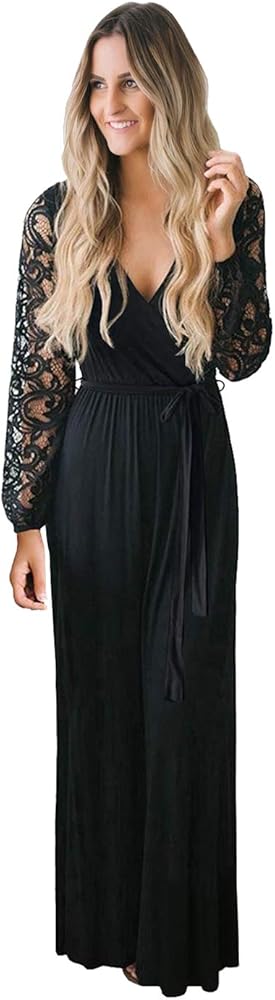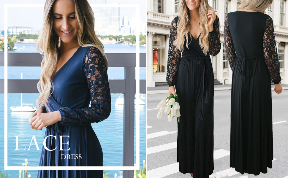 المميزات: فستان طويل يأتي بأكمام طويلة من الدانتيل العتيق، ورقبة على شكل حرف V ملفوفة صناعيًا، وحزام ذاتي الربط وتنورة واسعة. الأكمام شبه الشفافة من الدانتيل مثيرة ولكنها أنيقة! رائع للسهرة الأنيقة أو الصور العائلية