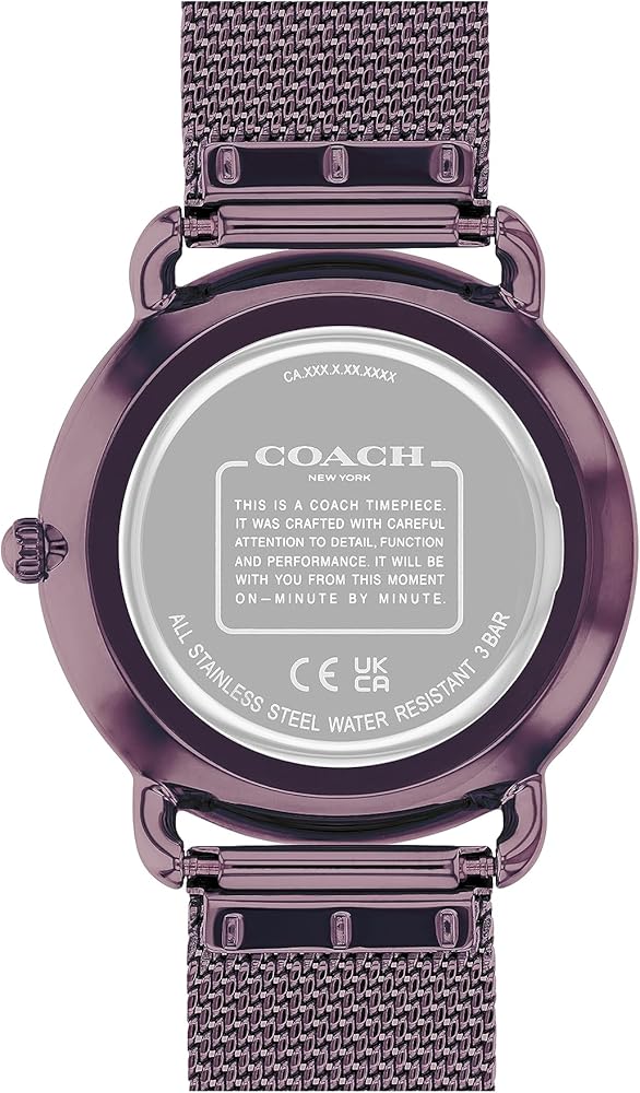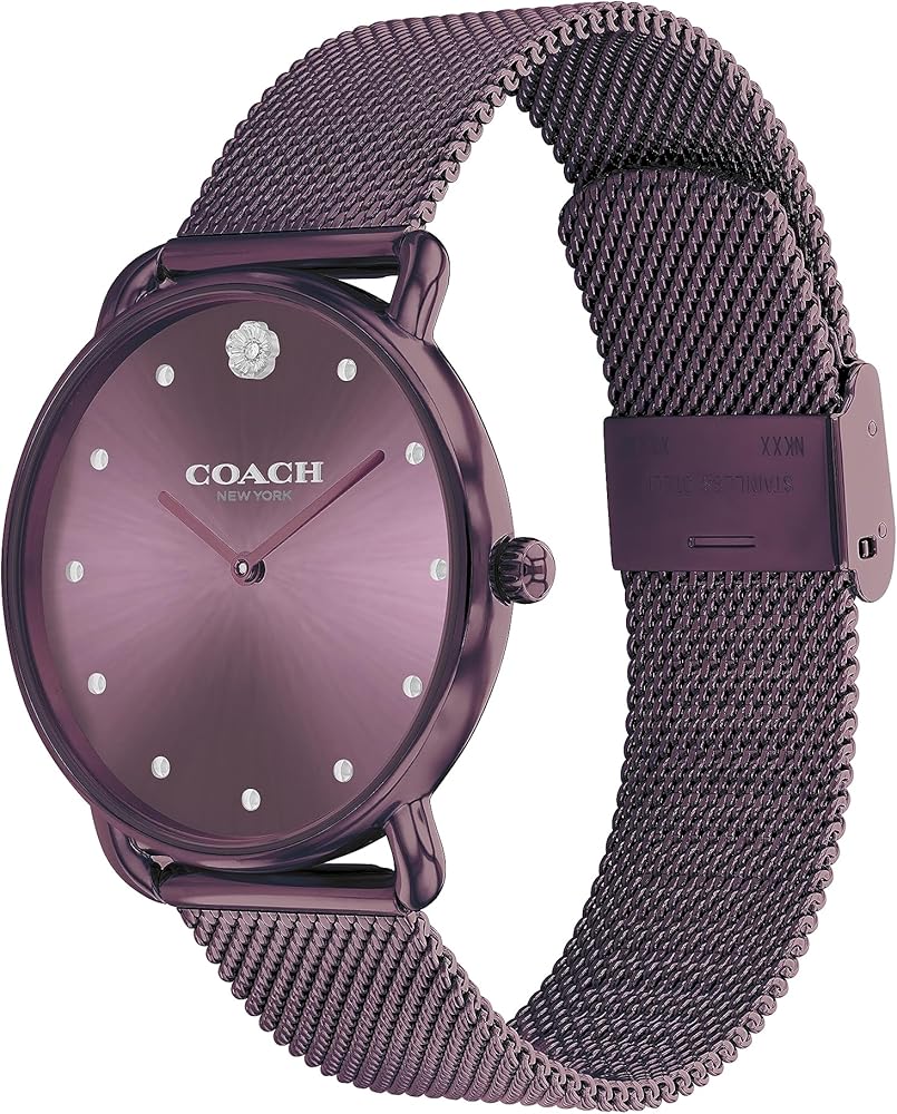 مواد عالية الجودة: تتميز هذه الساعة المستديرة المطلية بالأيونات الأرجوانية بسوار شبكي أنيق، وتتميز بميناء أرجواني على شكل أشعة الشمس ومفصل بعلامات من الفولاذ المقاوم للصدأ وزخرفة Coach Tea Rose عند الساعة 12.