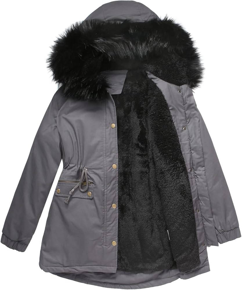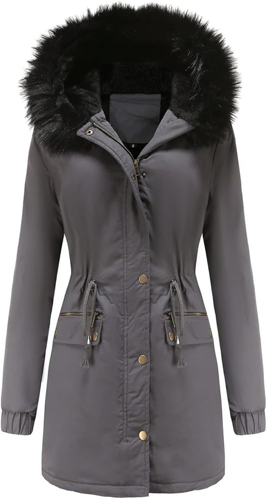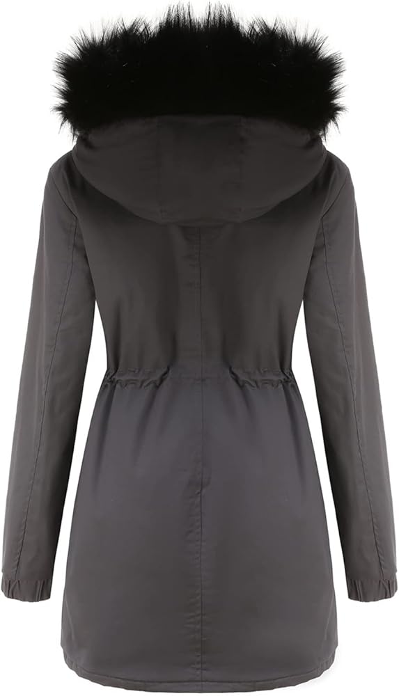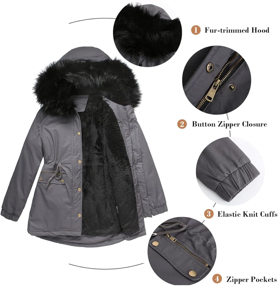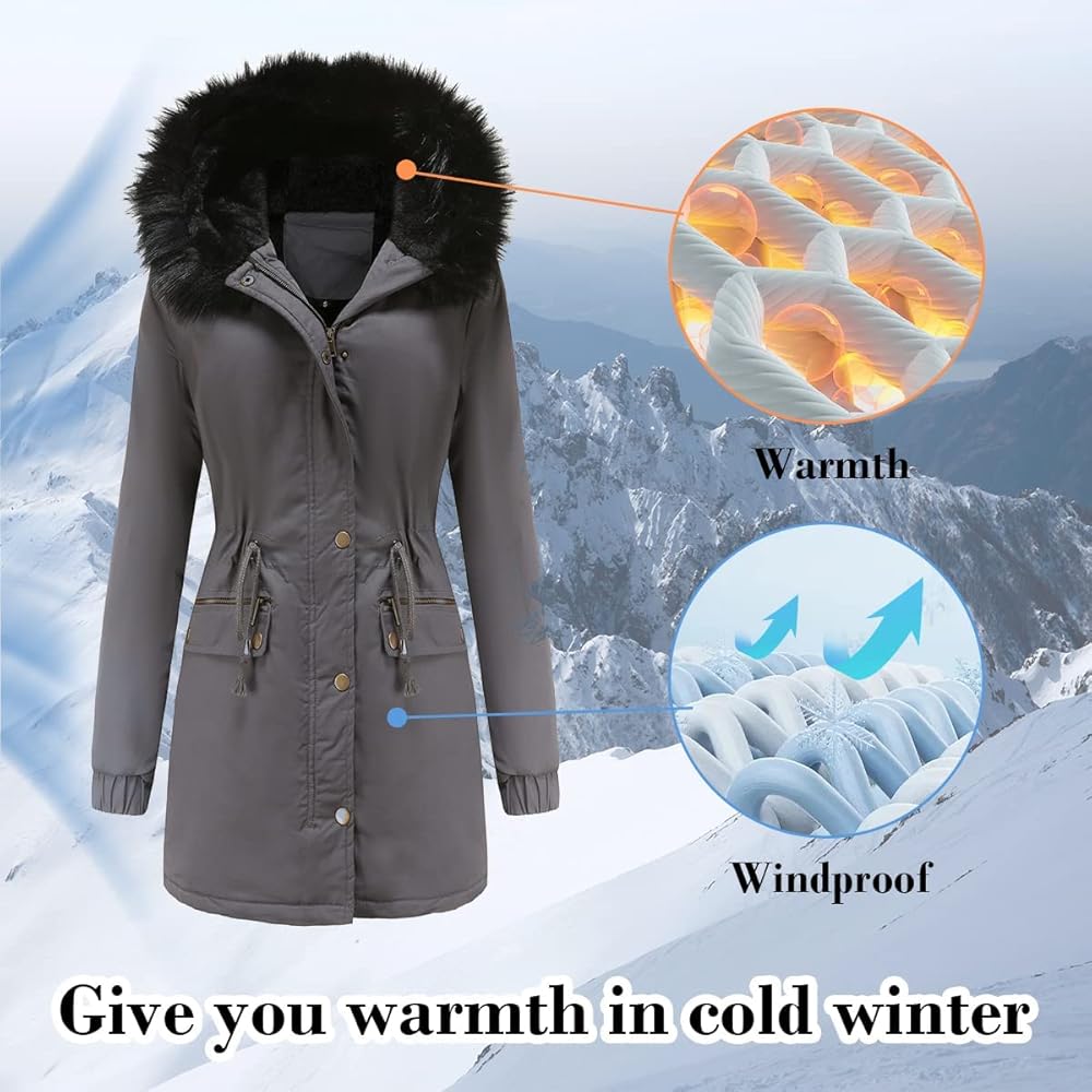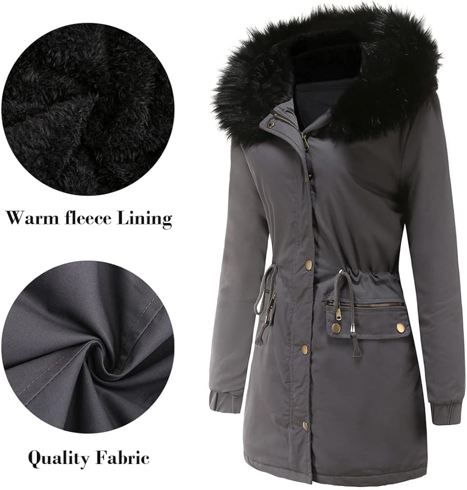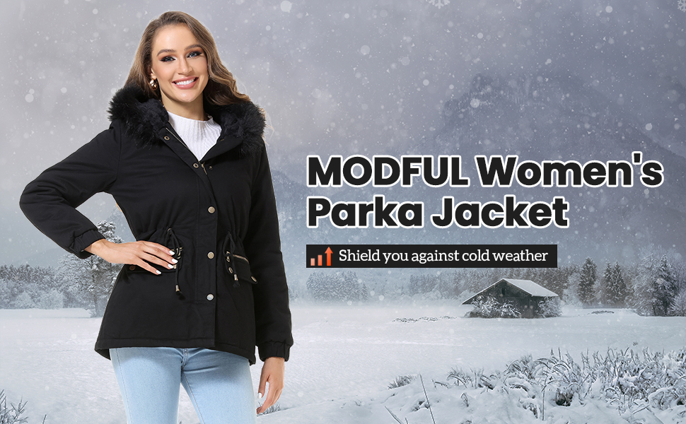 [الدفء]: هذه السترة الشتوية النسائية مبطنة بمادة الصوف عالية الجودة التي تعزز دفء هذه السترة. الأصفاد مرنة لمنع دخول الرياح الباردة. غطاء الرأس المزخرف بالفرو الصناعي يحمي الرأس والرقبة من الرياح الباردة.