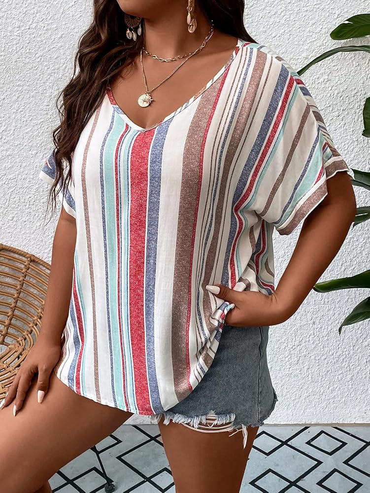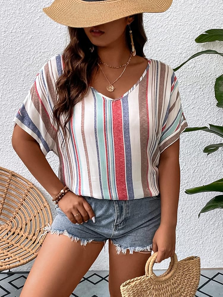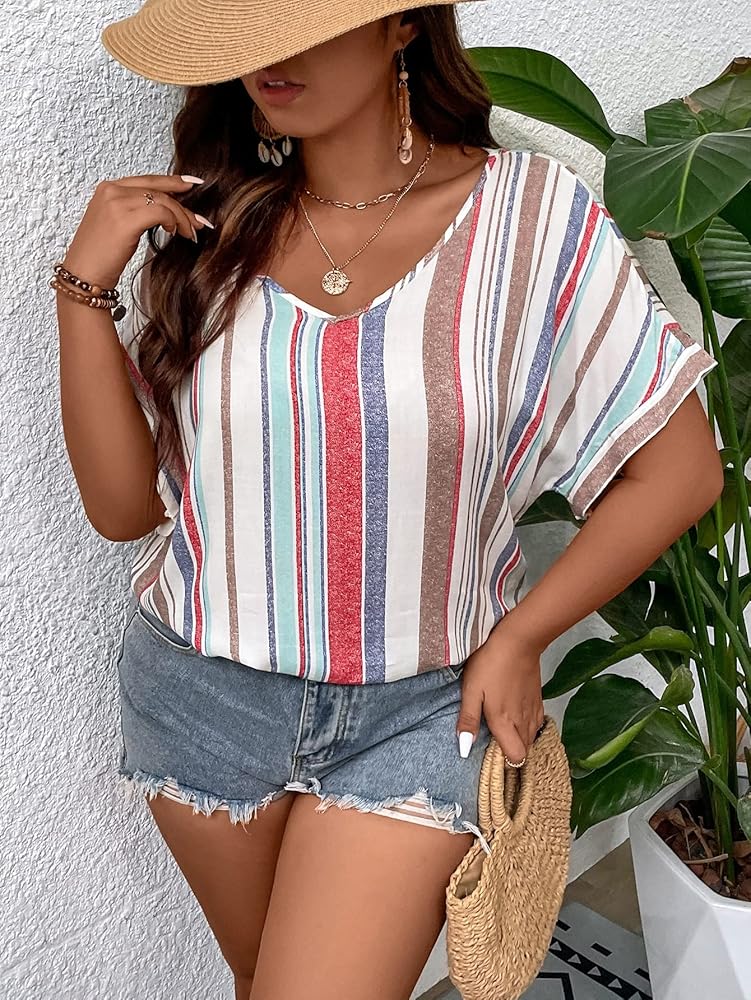 السمات: مخطط، رقبة على شكل حرف V، أكمام قصيرة، قمصان نسائية، عصرية