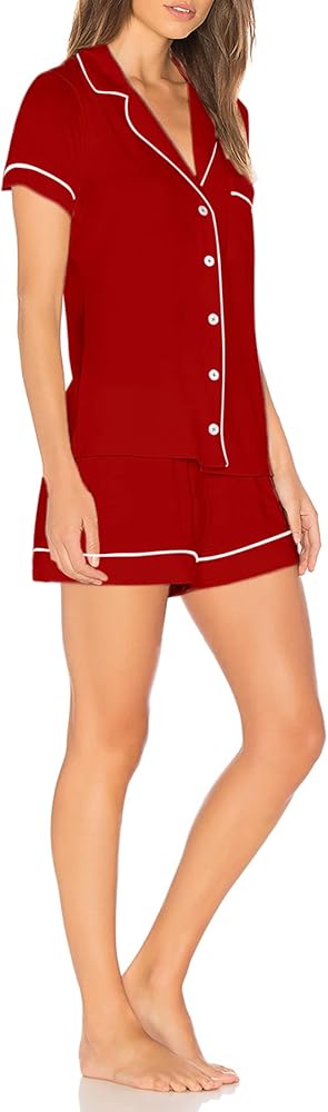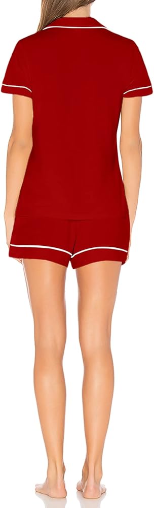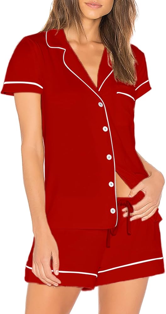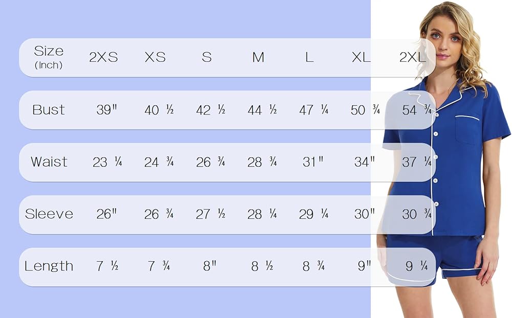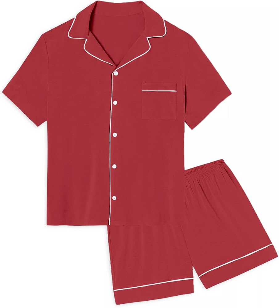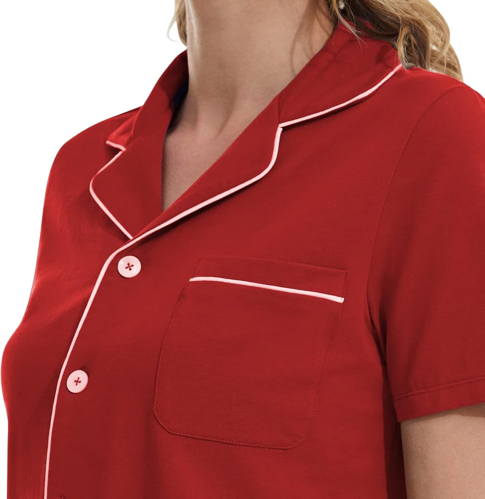 قمصان بأزرار لأعلى: تصل قمصان البيجامة إلى الورك، وأكمام قصيرة، وجيب واحد على الصدر، وتصميم كلاسيكي بأزرار سفلية مع ياقة مشقوقة للحصول على صورة ظلية أنيقة، ومزينة بخط متباين لمظهر أنيق أنيق.