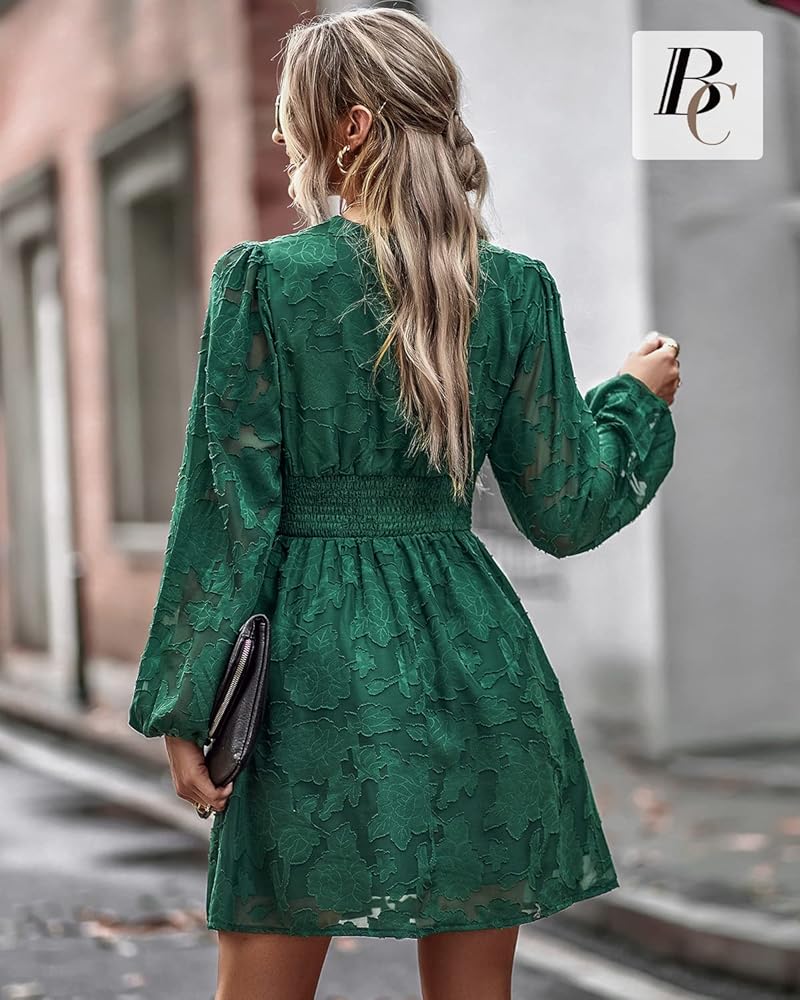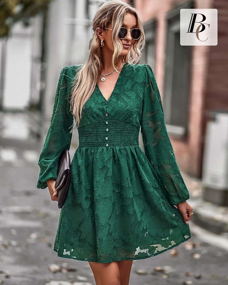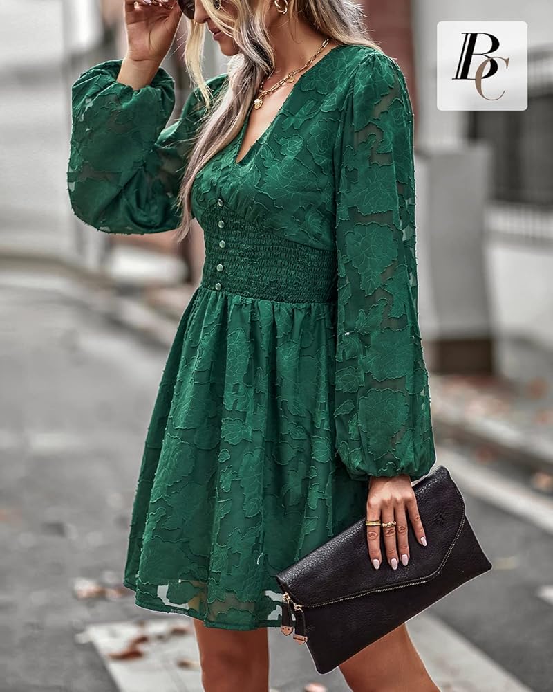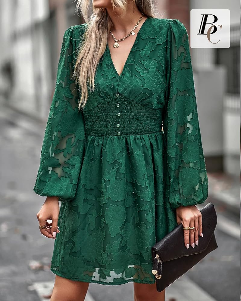 • نمط أنيق: رقبة عميقة على شكل حرف V، وأكمام طويلة واسعة. فستان شيفون على شكل حرف A مع خصر مرن. هذا الفستان الأنيق ساحر.