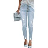 - يتميز هذا الجينز ذو المقاس النحيف بأزرار أمامية وتصميم حاشية مهترئة، و5 جيوب أساسية، وجينز ضيق ممزق للنساء.