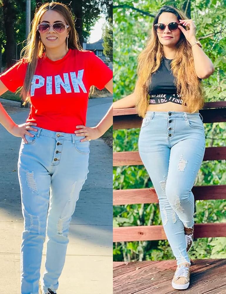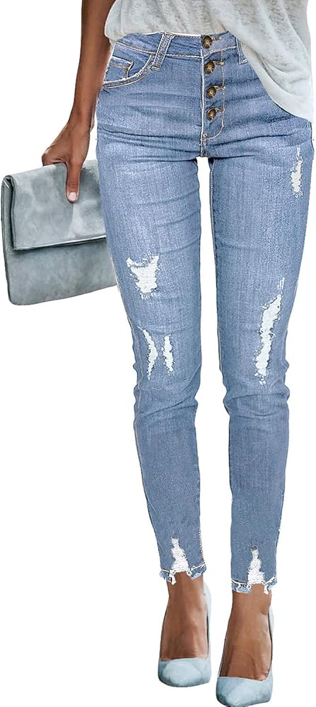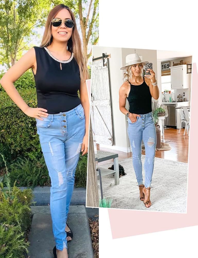 - سراويل جينز عالية الخصر، جينز كاجوال قابل للتمدد للنساء، جينز ضيق للسيدات، زر للإغلاق.