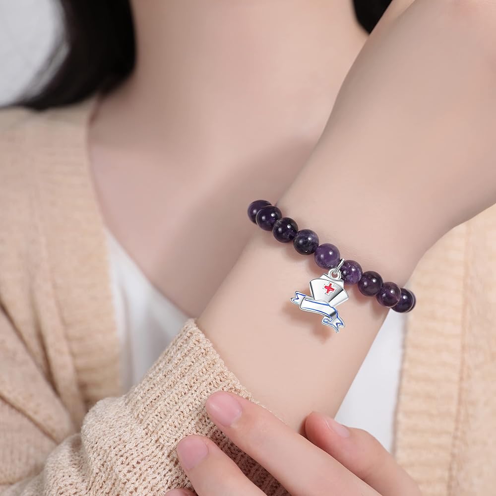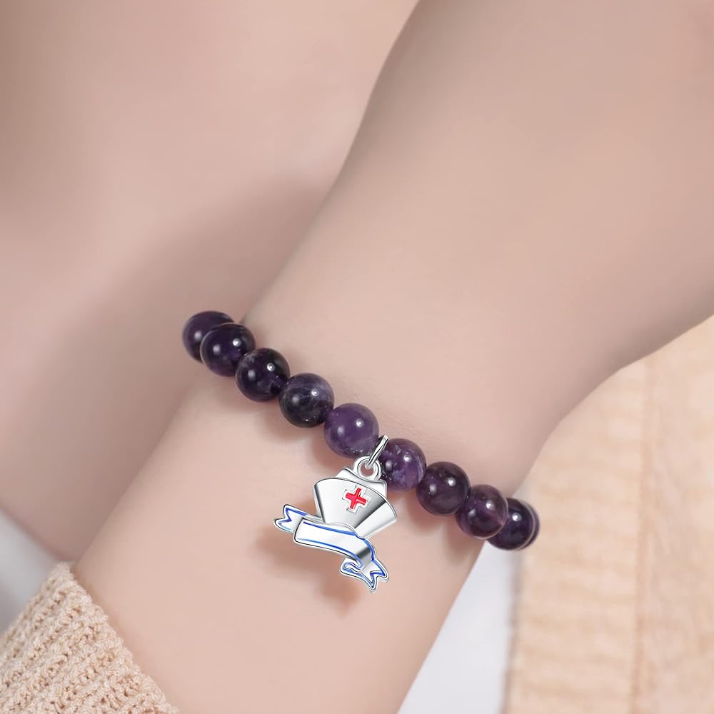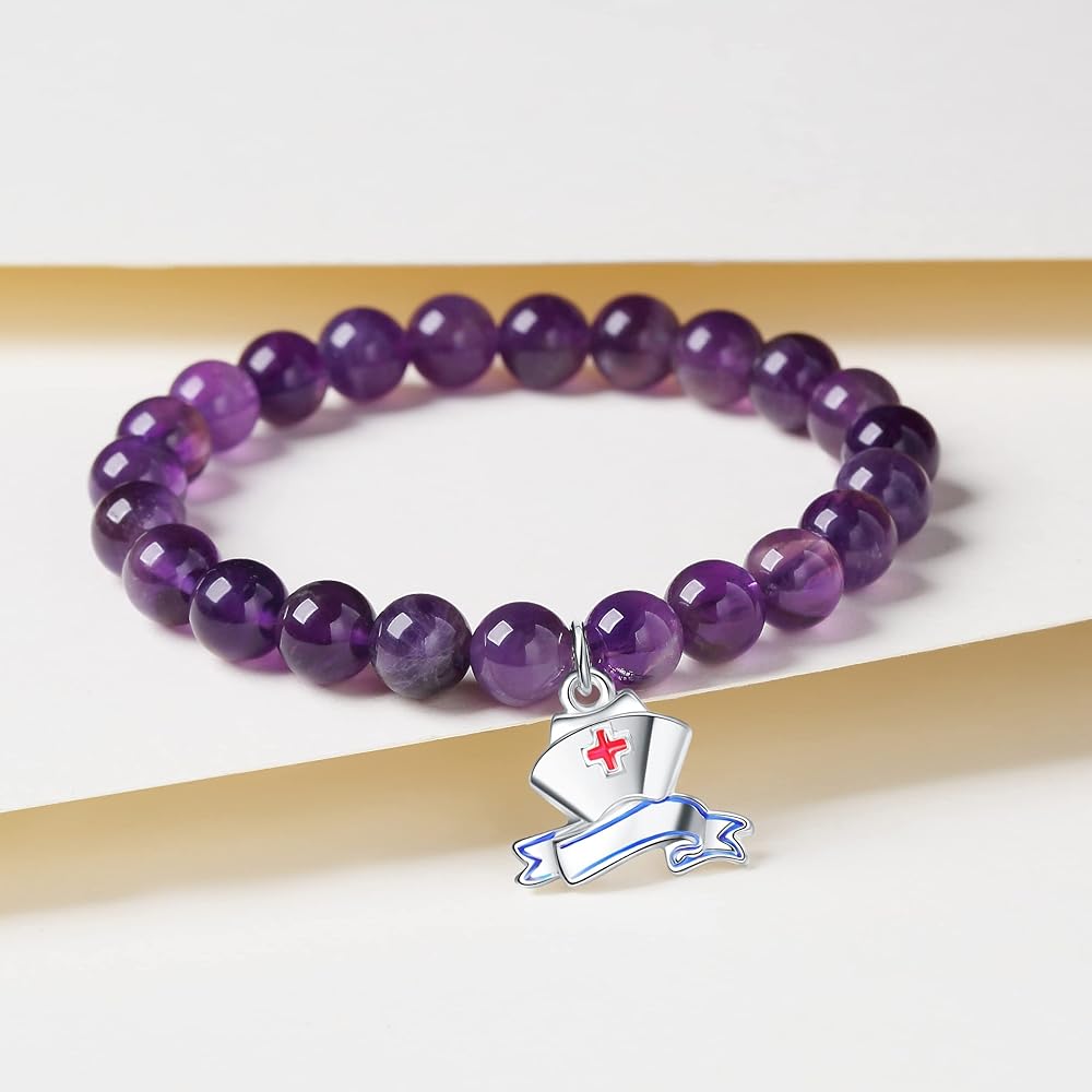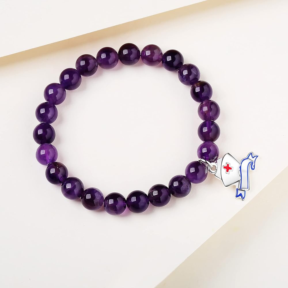 ♥Material: Natural color natural stone, the bracelet is made of natural amethyst beads. With cute nurse cap charm. Very shiny and will never turn color. The bracelet is completely non-reactive on sensitive skin.