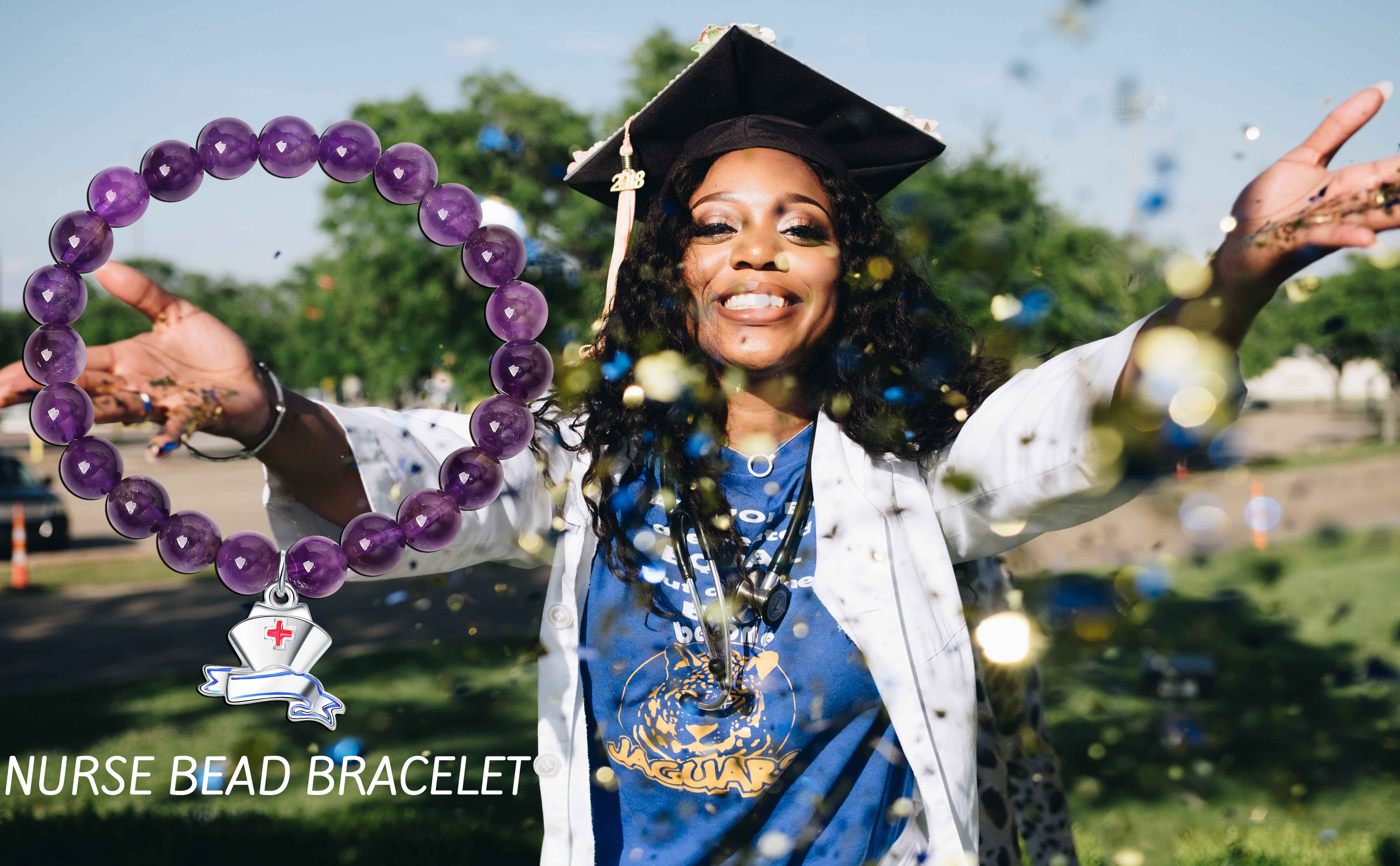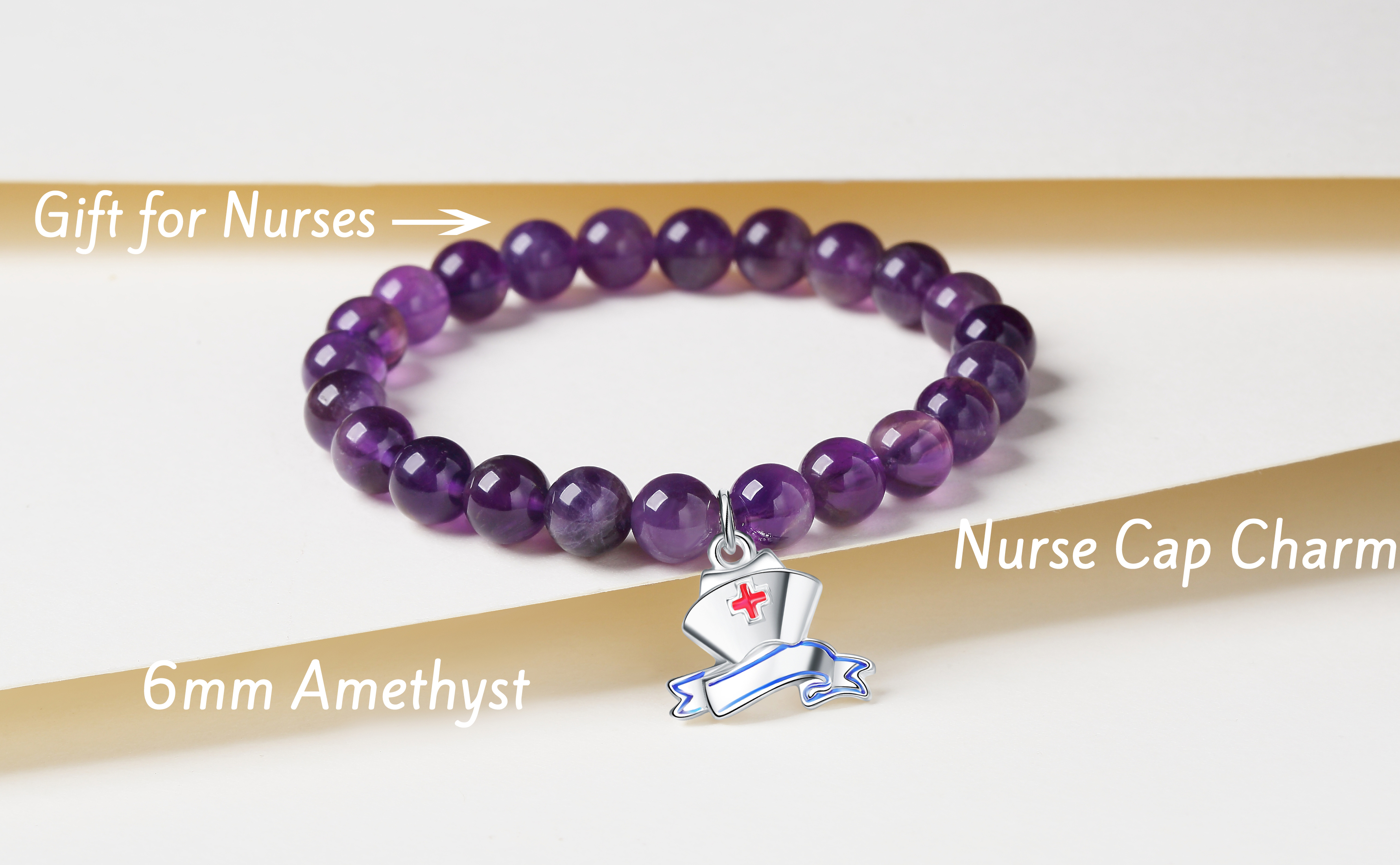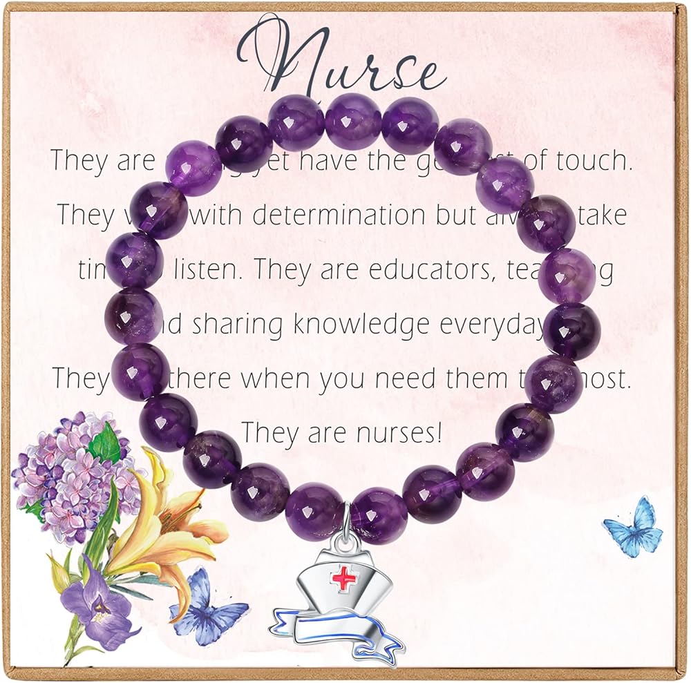 ♥Material: Natural color natural stone, the bracelet is made of natural amethyst beads. With cute nurse cap charm. Very shiny and will never turn color. The bracelet is completely non-reactive on sensitive skin.