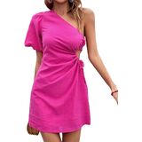 - المزايا: كتف واحد، كم قصير منتفخ، خصر مقصوص، رباط، فستان قصير