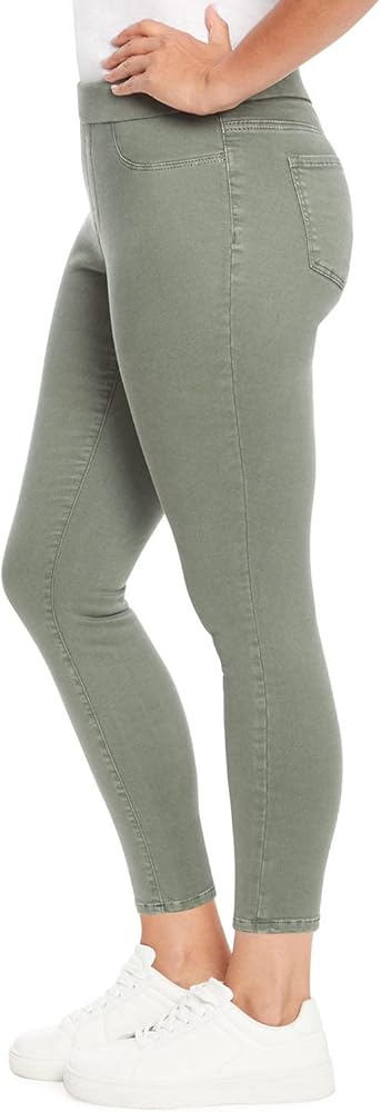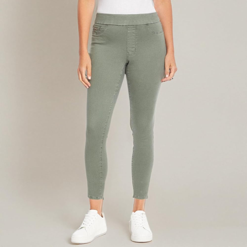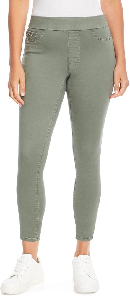 Our Nine West Pull-On Leggings for women are made to keep you comfortable and stylish. The slight stretch material helps these jeans for women move with your body throughout the day. A perfect skinny fit to keep you on trend and stylish. The elastic waistband womens capris makes it easy to fit your body comfortably for all day use. The high rise helps slim parts of the body while making your legs appear longer. These high waisted leggings for women feature two faux front pockets, one functional coin pocket, and two functional back pockets to ensure you have room to carry your everyday essentials. These pull on jeans for women feature a 26" inseam and a rolled cuff. Sizes are available from 4-16 in an assortment of colors and washes.