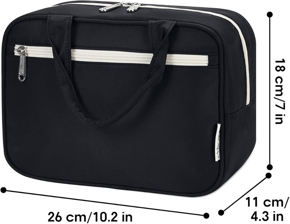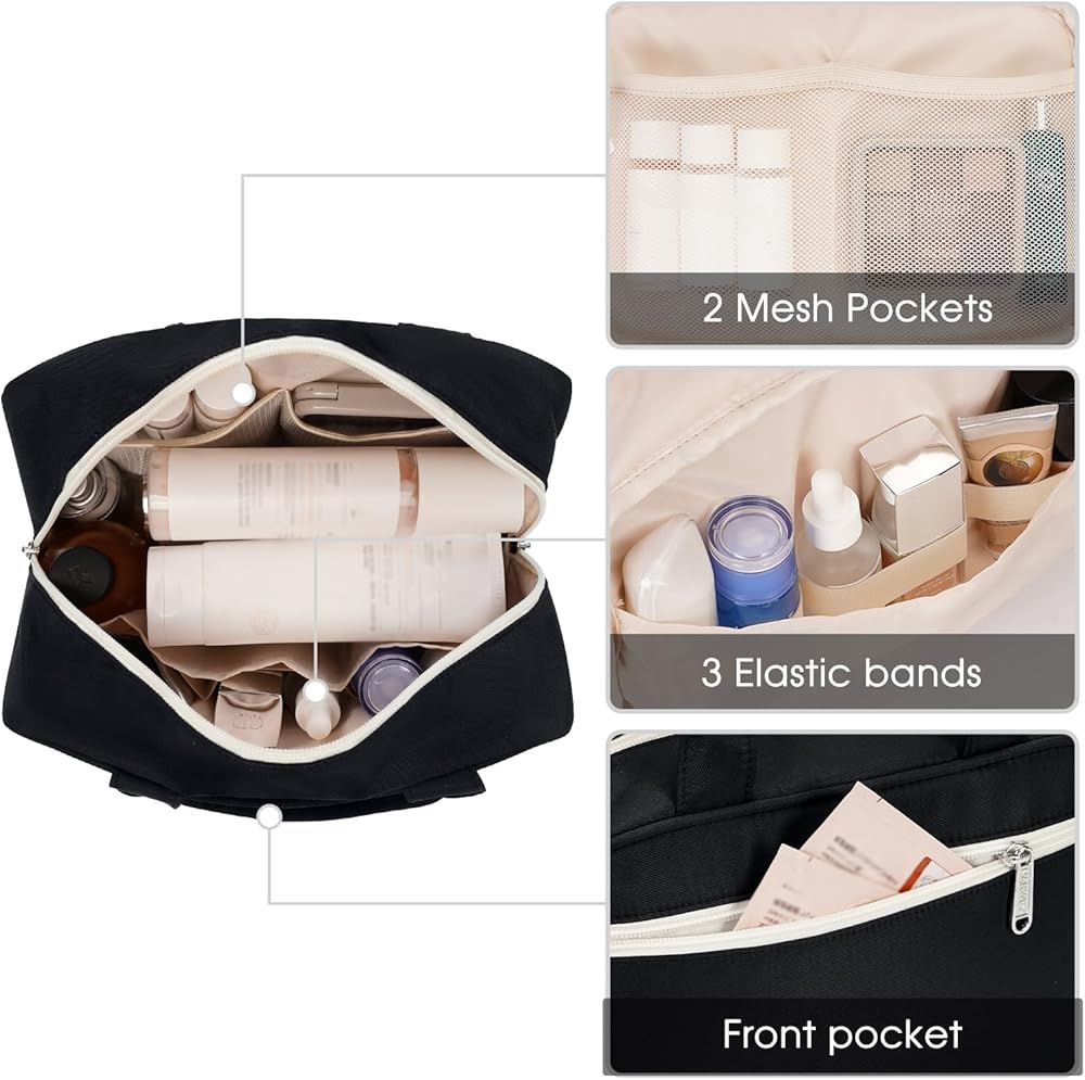 ✅ حجرة رئيسية واسعة. الطول العملي الذي يبلغ 10.2 بوصة (26 سم) يمكن أن يناسب بسهولة مستحضرات التجميل ذات الحجم العادي بالإضافة إلى منتجات العناية بالبشرة الكبيرة مثل الشامبو والبلسم واللوشن وما إلى ذلك، بالإضافة إلى جيبين شبكيين وطبقة منفصلة مع أشرطة مرنة تحافظ على العناصر منظمة وفي مكانها بشكل جيد.