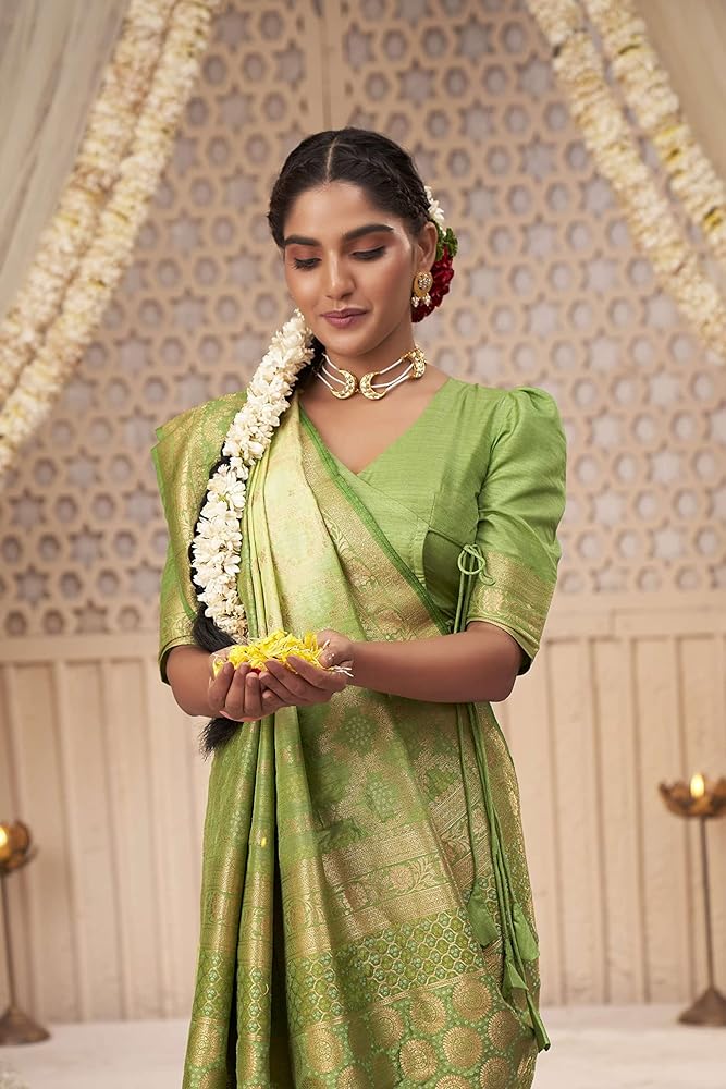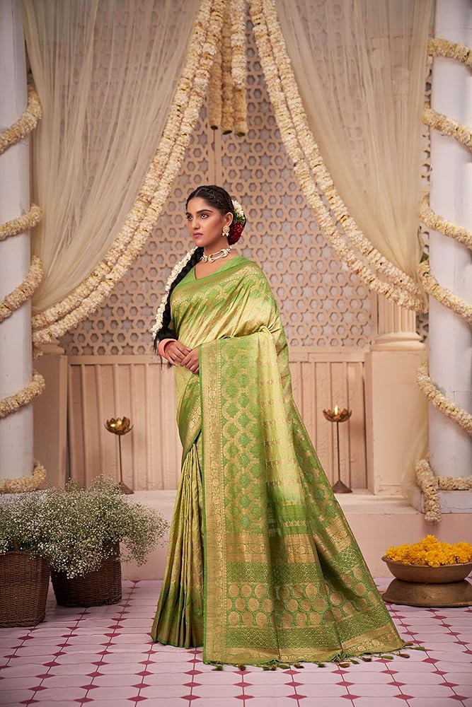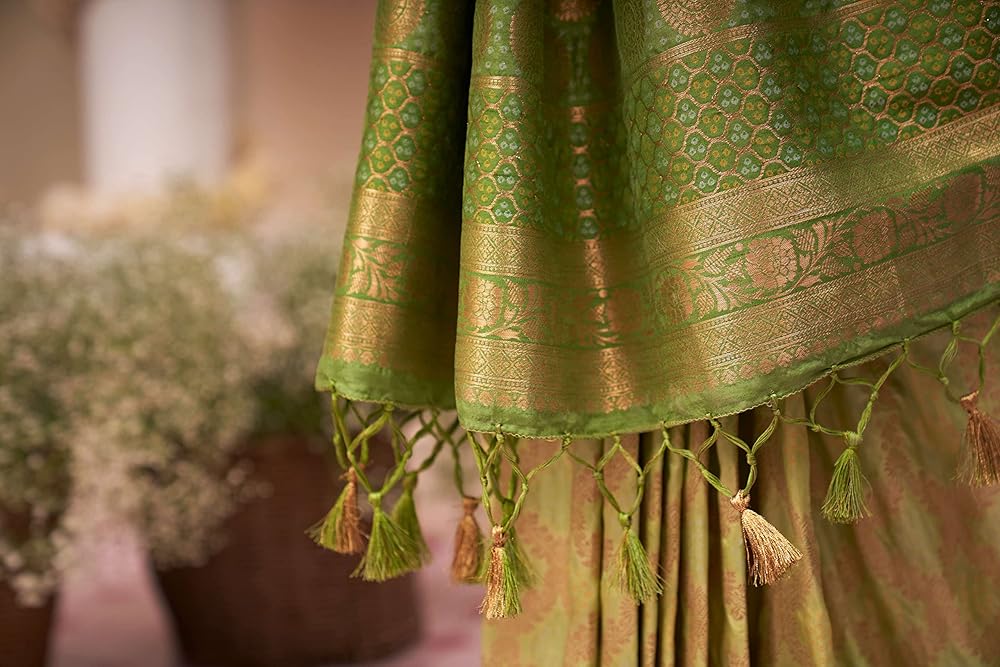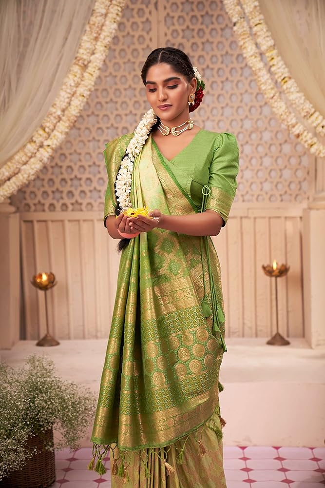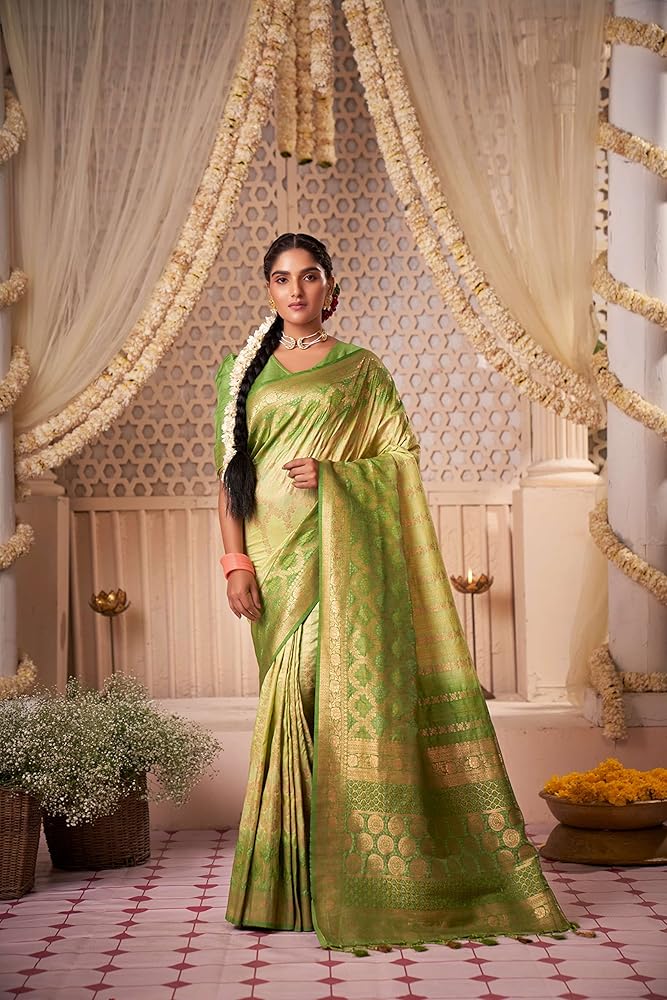 الساري Vardha للنساء من Banarasi الخام من الحرير المنسوج بدرجتين من اللون | هدية زفاف ديوالي الهندية ساري وبلوزة غير مخيطة