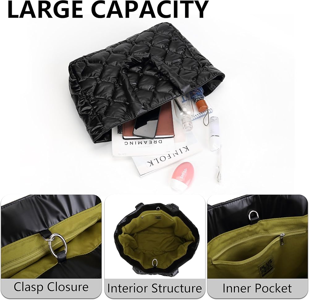 سعة كبيرة: 14.57 بوصة × 5.12 بوصة × 12.99 بوصة (الطول × العرض × الارتفاع). هذه الحقيبة المنتفخة مصممة بمشبك علوي وجيب داخلي بسحاب لأغراضك الصغيرة المهمة. السعة الكبيرة يمكنها حمل الكمبيوتر المحمول وبعض الأنسجة والدفاتر والأقراط والأقلام وغيرها من الحلي والمستلزمات اليومية ومستحضرات التجميل.حقيبة حمل مبطنة واسعة جدًا.