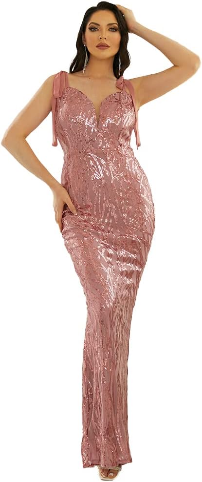 التصميم: هذا الفستان الرسمي برقبة على شكل حرف V، وترتر لامع غير منتظم الملمس، وحمالات بأربطة، بدون أكمام، وبدون ظهر، وطول طويل، وتصميم عالي الخصر يبرز شخصيتك الطويلة وأناقتك بوضوح.