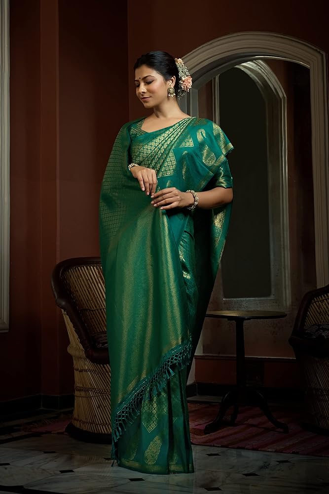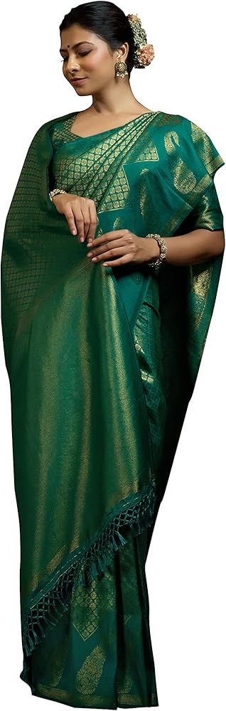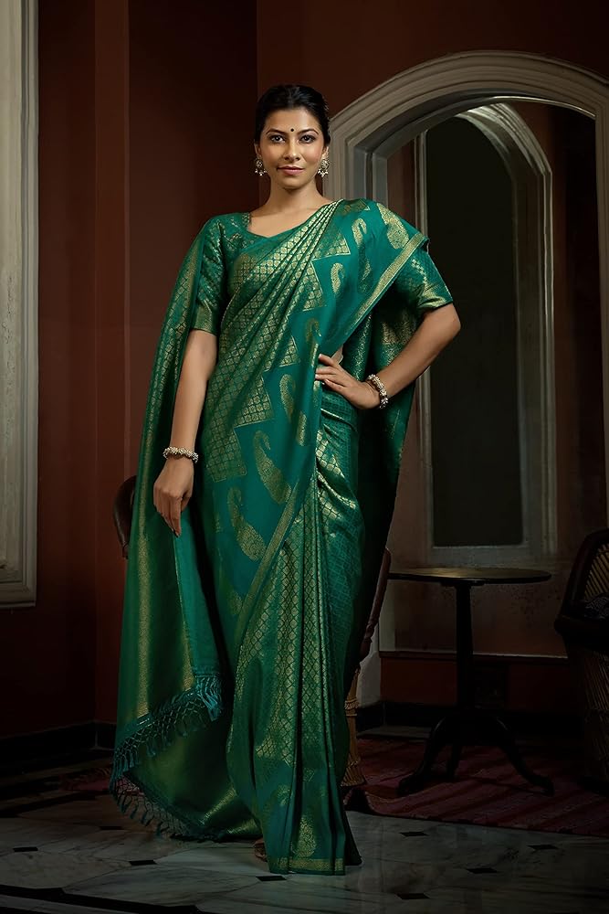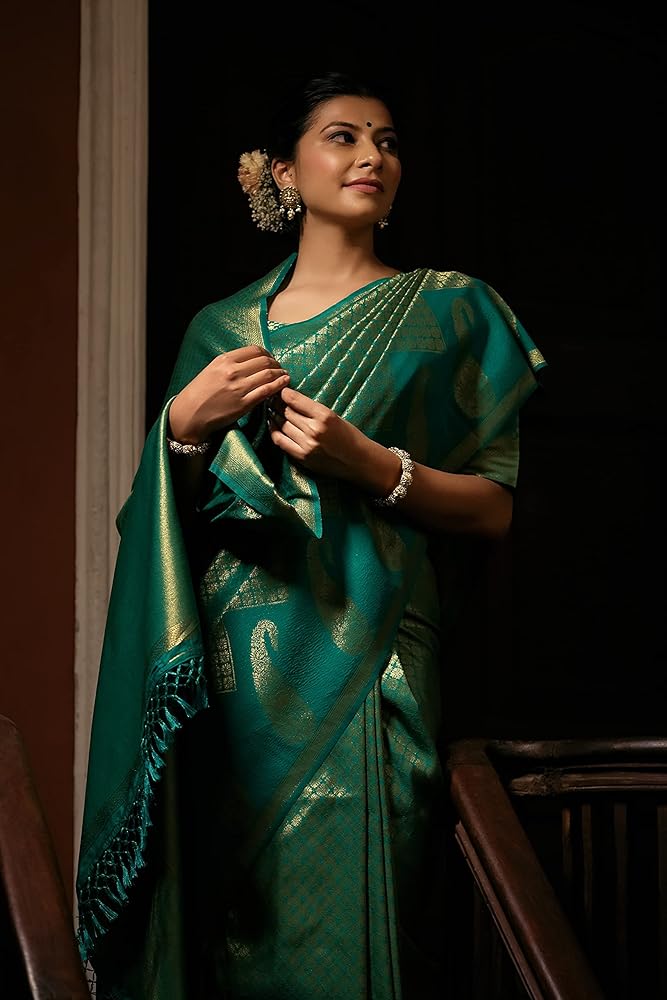 نسيج الساري:- حرير باناراسي كانجيفارام الخام، قماش البلوزة:- حرير باناراسي كانجيفارام الخام