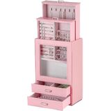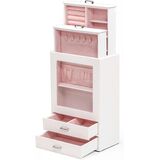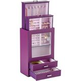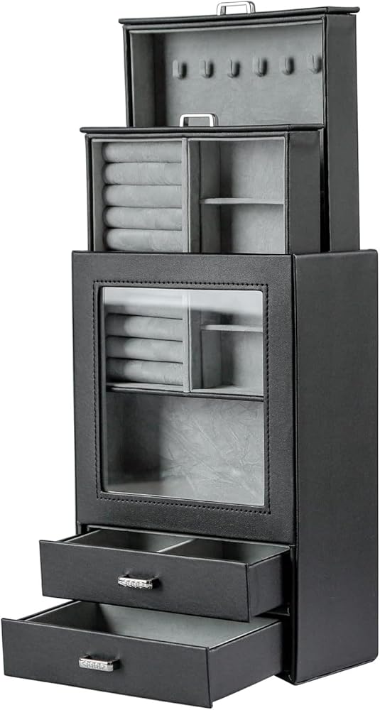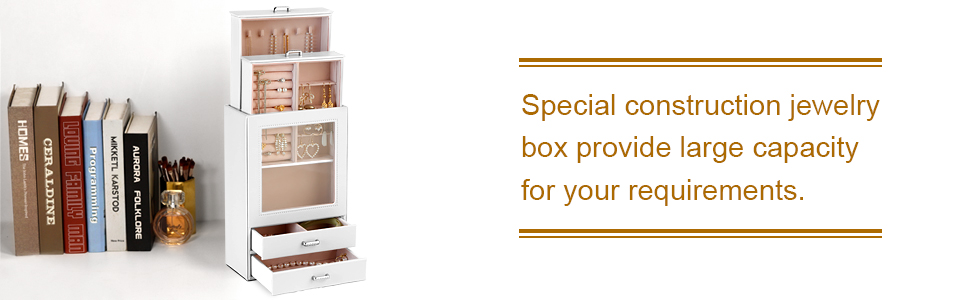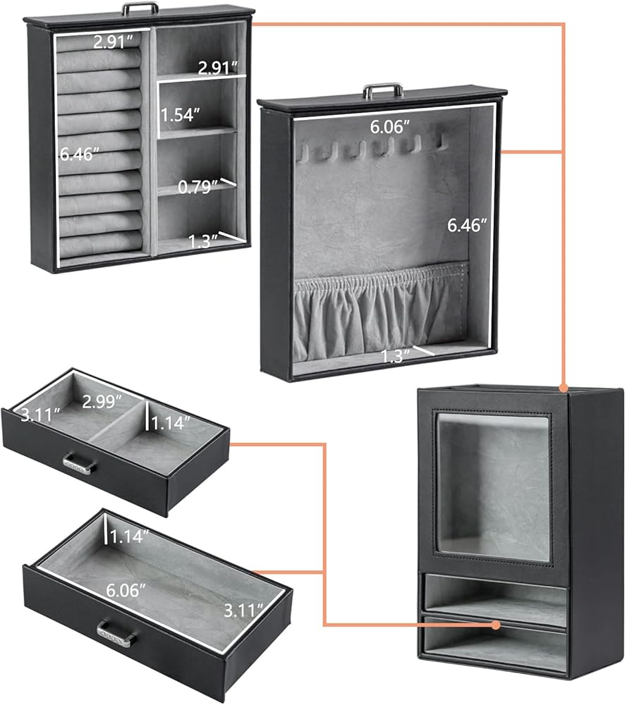 منظم المجوهرات يحتوي على 4 أدراج. يحتوي الدرج 1 على لفة حلقية و3 بطاقات أقراط بستة فتحات قابلة للإزالة، بينما يحتوي الدرج 2 على 6 خطافات مع حقيبة تخزين للقلائد والمعلقات لمنعها من التشابك. ينقسم الدرج الأفقي إلى مساحتين كبيرتين يمكن وضع الملحقات الكبيرة فيهما مثل البروشات والساعات وزهور غطاء الرأس.