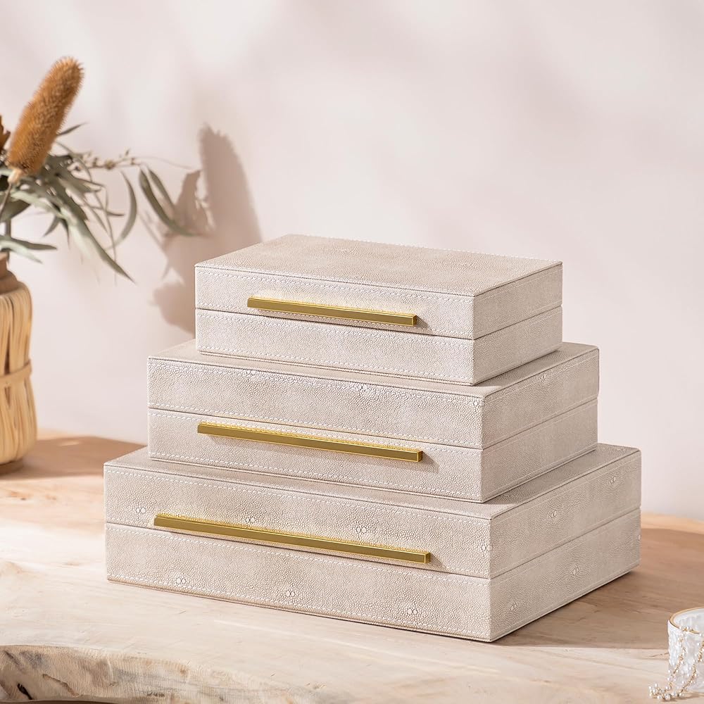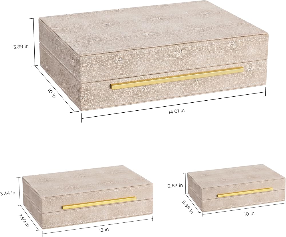 صناديق زخرفية مصممة بشكل فريد: المواد: الإطار الخارجي - جلد البولي يوريثان بنمط سمكة الشيطان، بطانة داخلية - جلد سويدي، إطار - MDF، قفل - أجزاء صلبة، السطح مصنوع من جلد البولي يوريثان الفاخر مع نمط عاجي شاغرين، والجزء الداخلي مبطن جيدًا بجلد سويدي صناعي التي لمست ناعمة وسلسة.