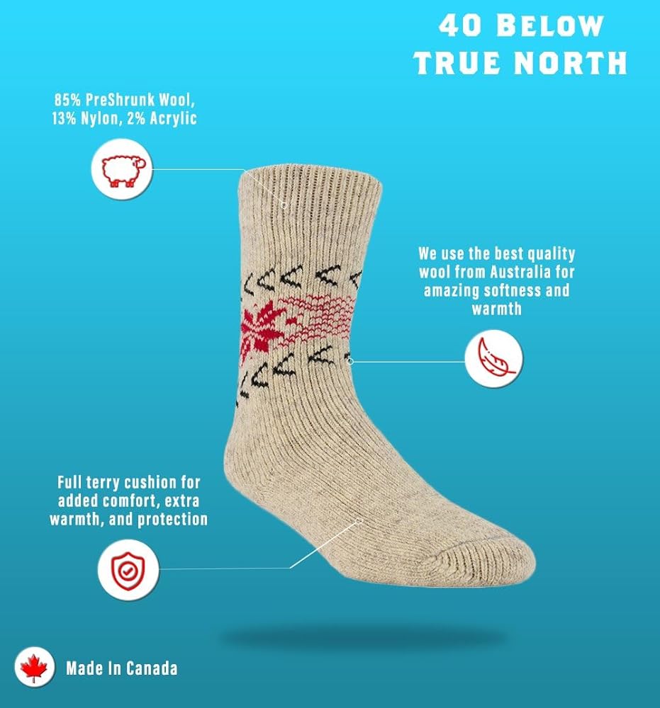 These are similar to our regular -40 Below Artic Trail socks but with a unique snowflake design on the leg. If you are looking for one of the warmest socks available look no further these contain an astonishing 85% wool! It was designed for people who require a sock that can keep their feet dry and warm in the most extreme conditions. We recommend wearing a liner sock to help wick away moisture because it will keep your feet smelling fresher, warmer and blister free!