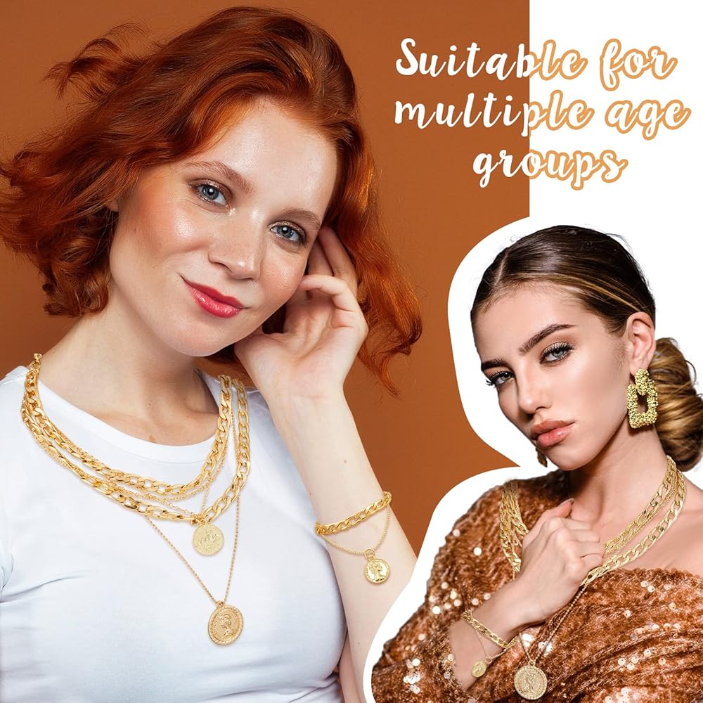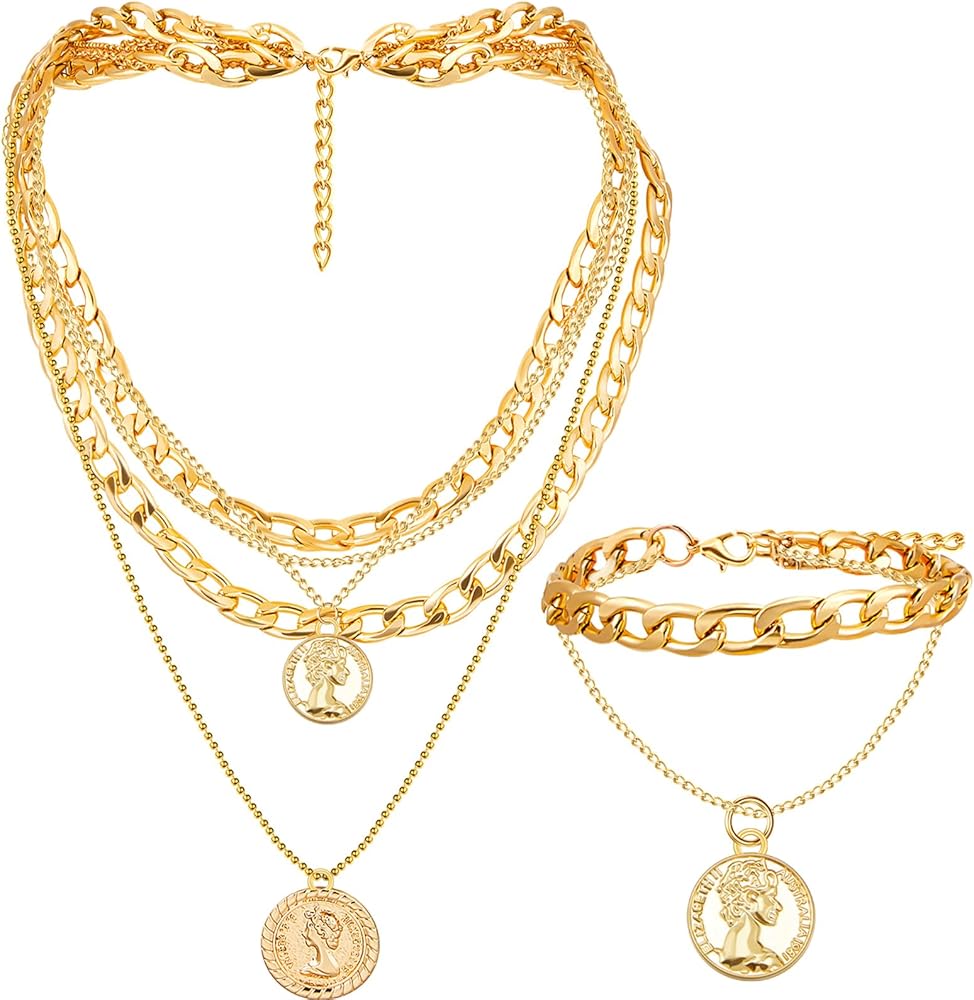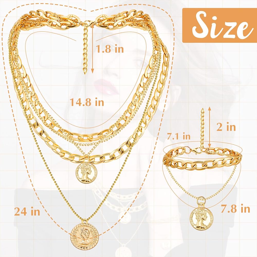 مزيج كامل: ستوفر لك العبوة قطعة واحدة من القلائد الذهبية المكتنزة للنساء وقطعة واحدة من السوار الذهبي المكتنز باللون الذهبي، وكلاهما مصمم بقلادة على شكل عملة معدنية ومتعددة الطبقات، ويمكنك ارتداؤها بشكل منفصل أو دمجها مع مجوهرات أخرى لخلق مظهر متعدد الطبقات ولائق، مما يوفر لك المزيد من الخيارات لملابسك