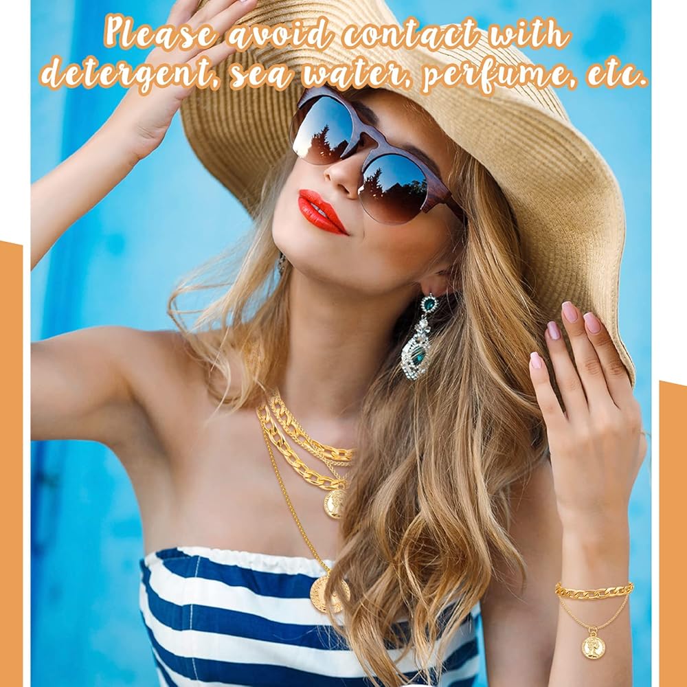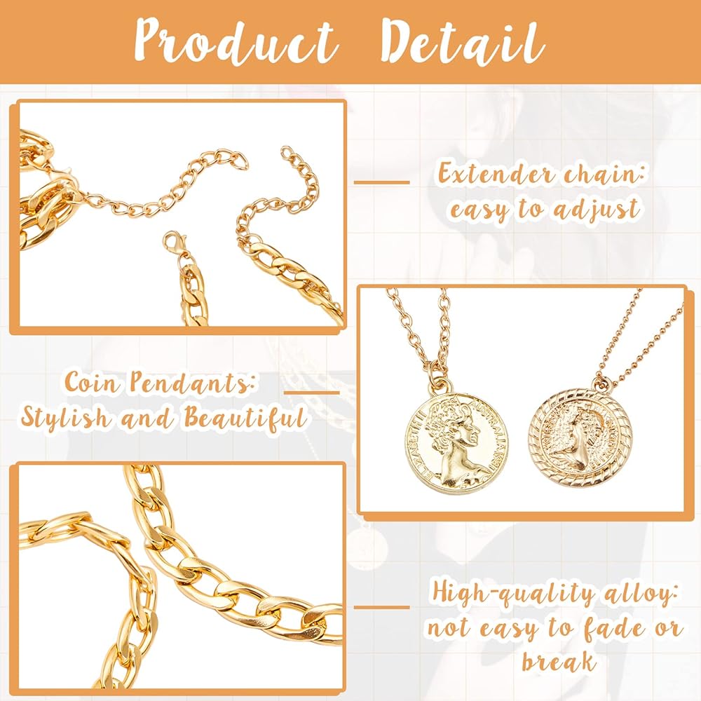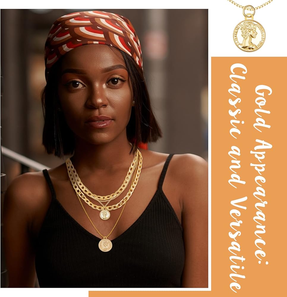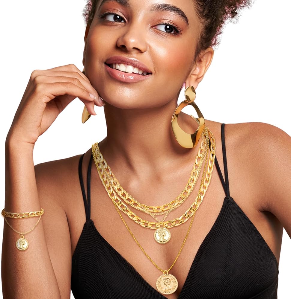 مزيج كامل: ستوفر لك العبوة قطعة واحدة من القلائد الذهبية المكتنزة للنساء وقطعة واحدة من السوار الذهبي المكتنز باللون الذهبي، وكلاهما مصمم بقلادة على شكل عملة معدنية ومتعددة الطبقات، ويمكنك ارتداؤها بشكل منفصل أو دمجها مع مجوهرات أخرى لخلق مظهر متعدد الطبقات ولائق، مما يوفر لك المزيد من الخيارات لملابسك
