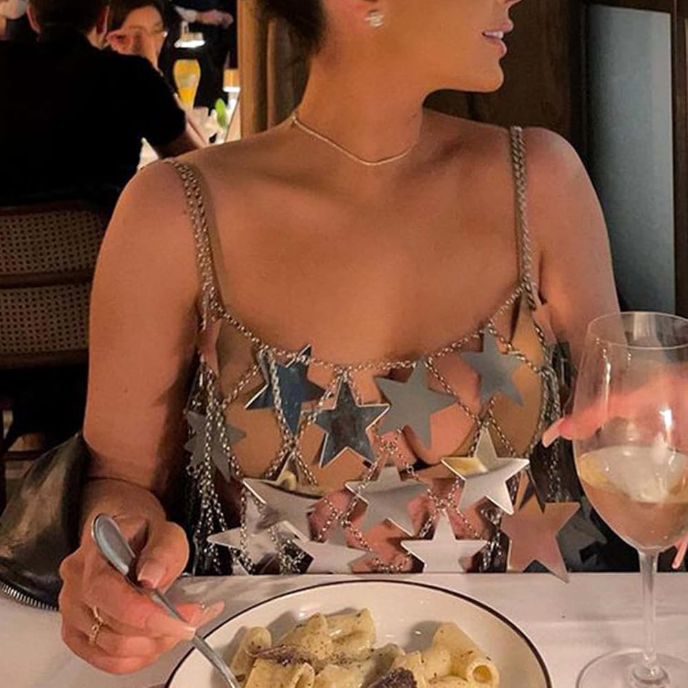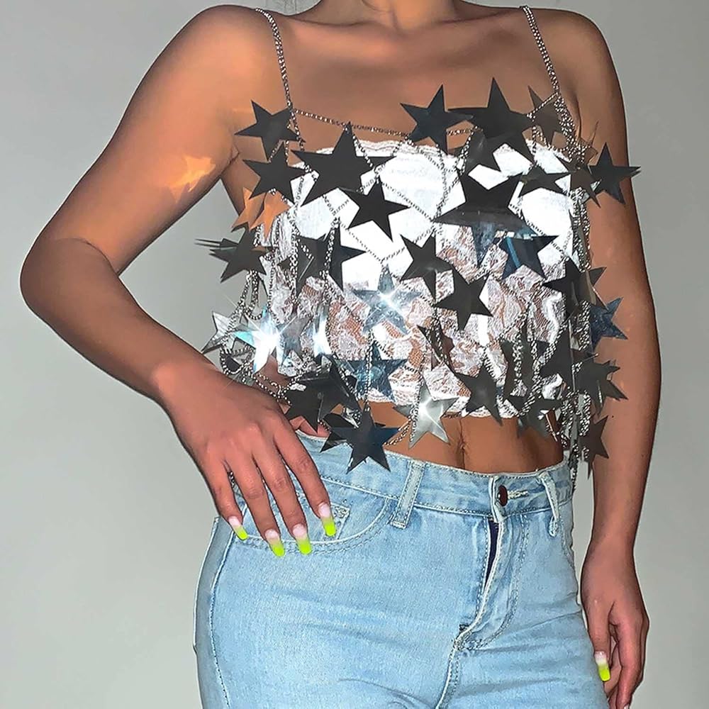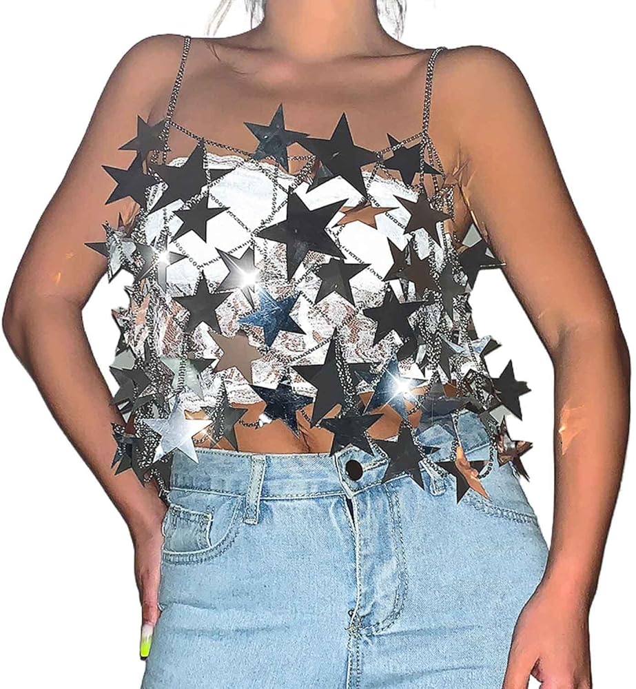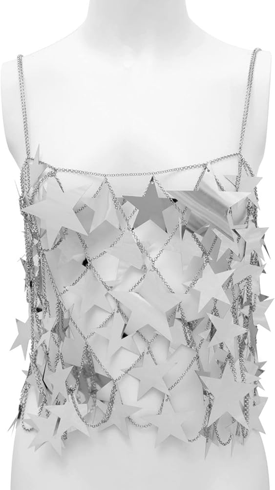 Aksod المرأة مثير نجمة انظر من خلال المحاصيل أعلى لامع الترتر الجوف خارج قميص بلا أكمام بيكيني الشاطئ نادي التستر أزياء الجسم سلسلة مجوهرات اكسسوارات للنساء والفتيات (أعلى الفضة)