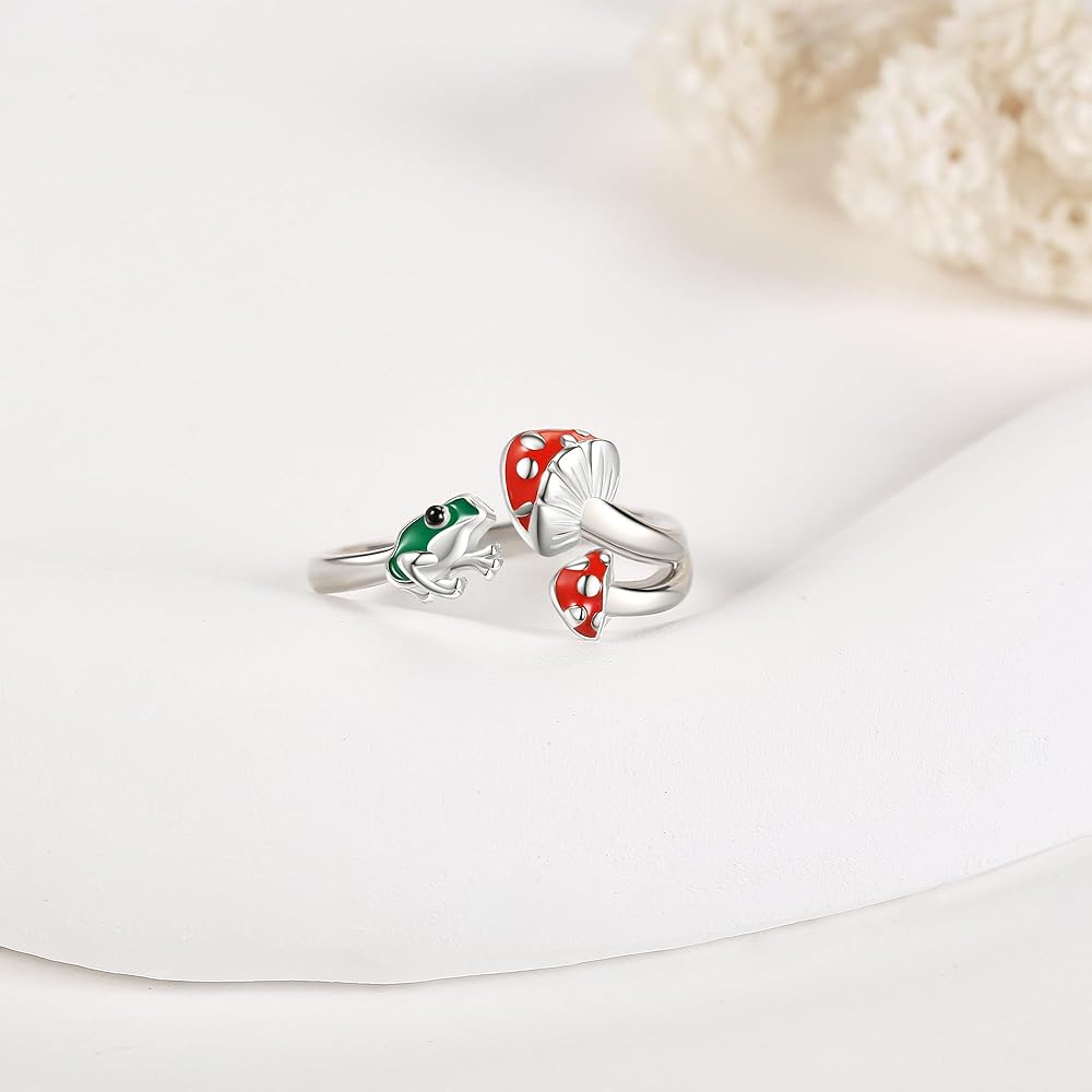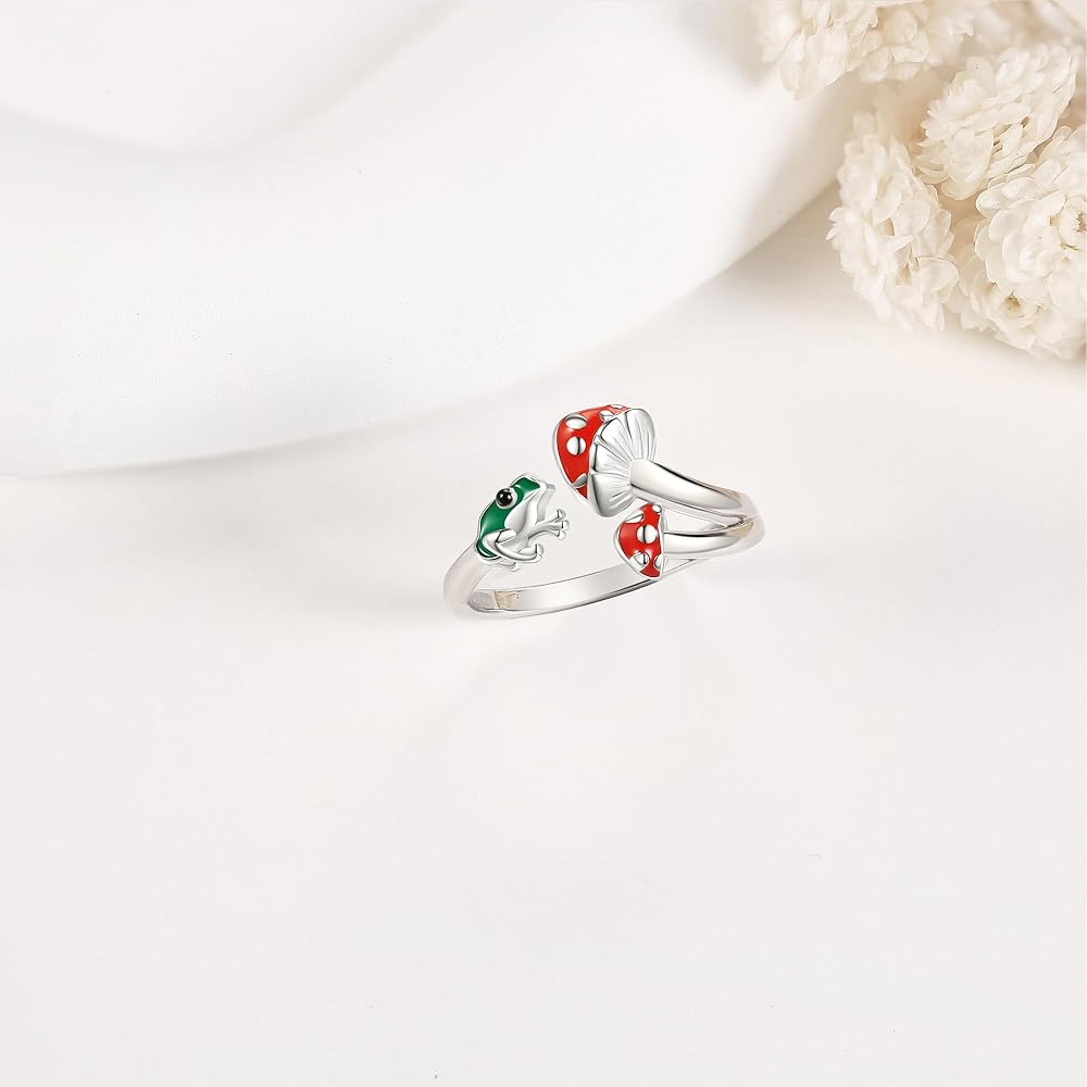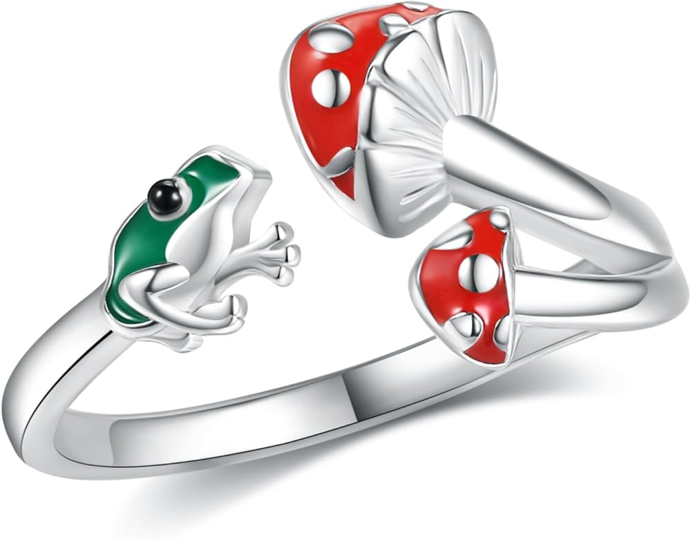 [Unique Design] Frog and Mushroom is most beautiful encounter, the frog and mushroom are symbols of good luck and energy . A cute frog and a red mushroom , showing a scene full of vitality. Frog mushroom rings, a cute finger jewelry gift for women girls, bring lucky for your loved one.