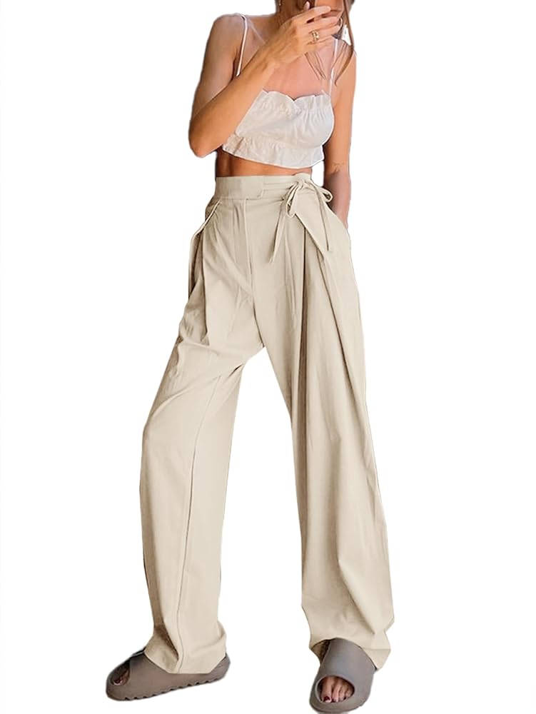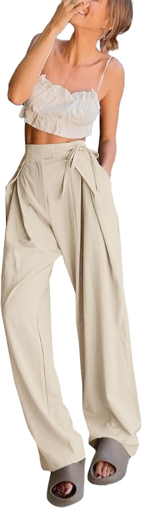 سراويل كاجوال للسيدات، سراويل بالازو جانبية ذات ربطة ذاتية، سراويل عمل مستقيمة واسعة الساق مع جيوب. تصميم فريد من نوعه عالي الخصر وساق واسعة لا يعزز الراحة فحسب، بل يمتد أيضًا ساقيك بصريًا.