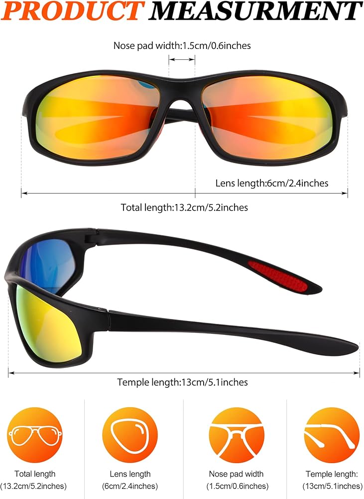 حجم الأبعاد: الطول الإجمالي للنظارات الشمسية الرياضية حوالي 13.2 سم/ 5.2 بوصة، والعدسة حوالي 6 × 4 سم/ 2.4 × 1.6 بوصة، ويبلغ طول الصدغ تقريبًا. 13 سم/ 5.1 بوصة، الحجم المناسب مناسب لوجوه معظم الأشخاص