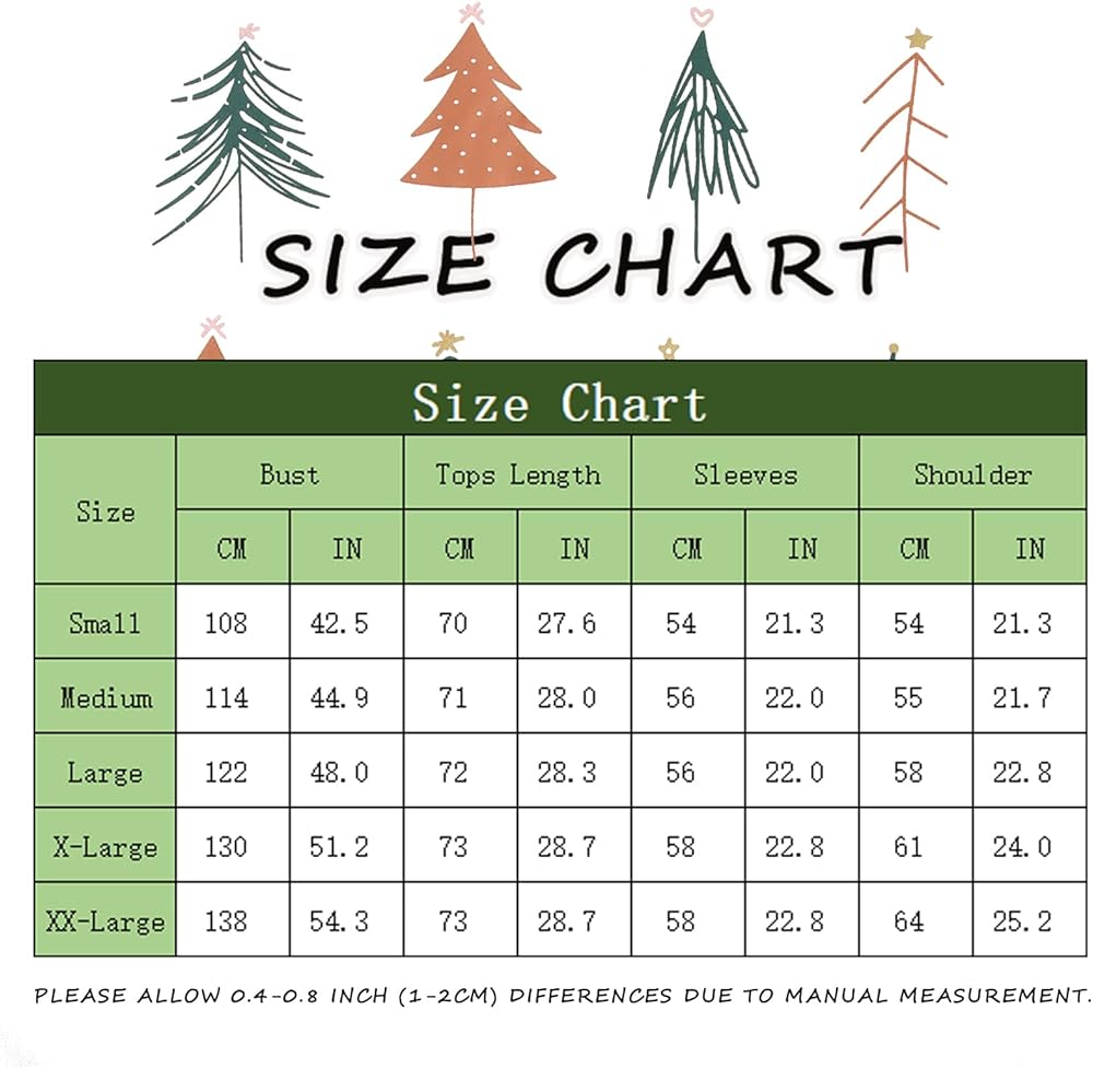 • 🎄المقاس-S-2XL، يرجى اختيار مقاسك بناءً على قياسات الصدر أدناه: (S)42.51 بوصة؛ (م) 44.88 بوصة؛ (ل) 48.03 بوصة؛ (XL) 51.18 بوصة؛ (XXL) 53.33 بوصة