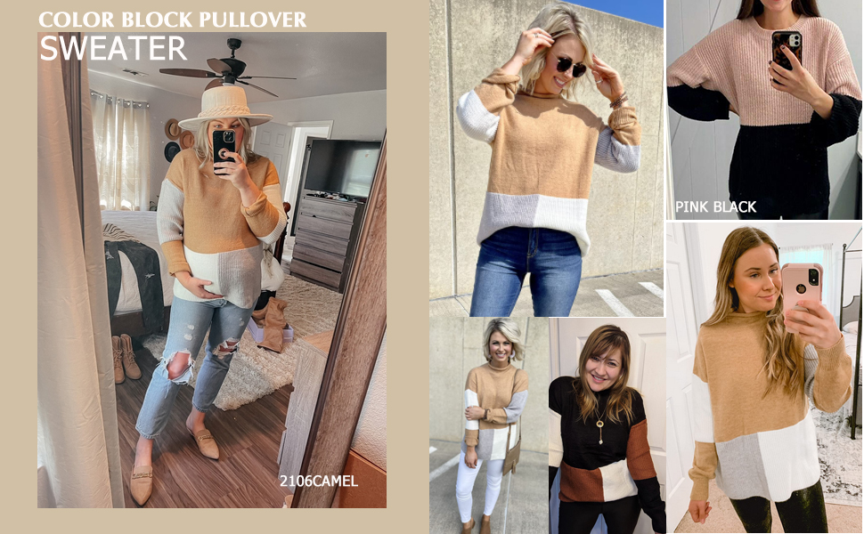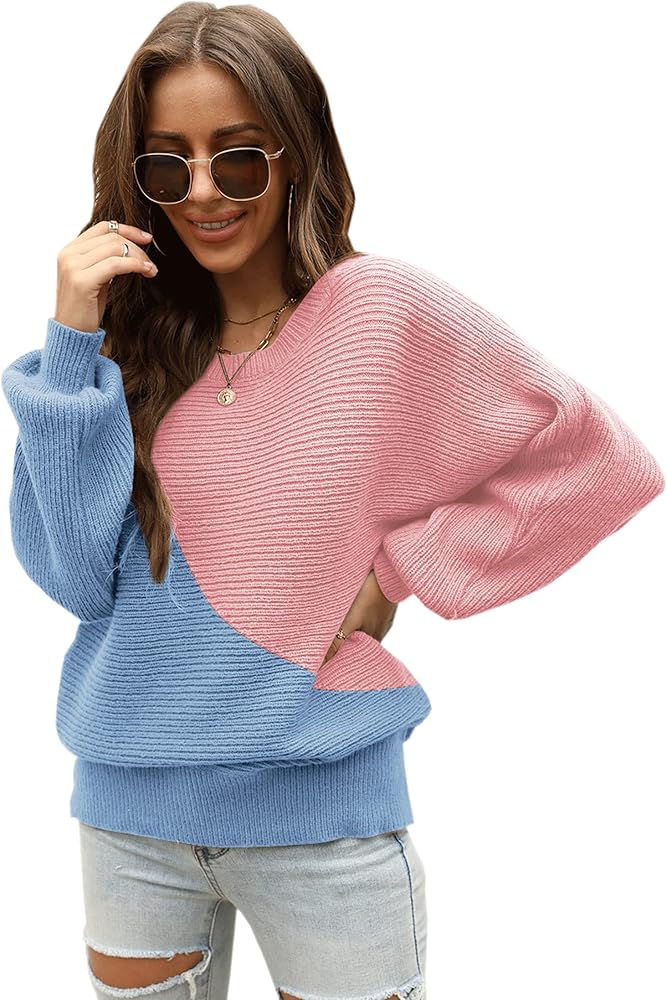 كنزة نسائية من Angashion-متماسكة كبيرة الحجم، كتلة الألوان، كتف منسدل، كم جناح الخفّاش، سترة علوية
