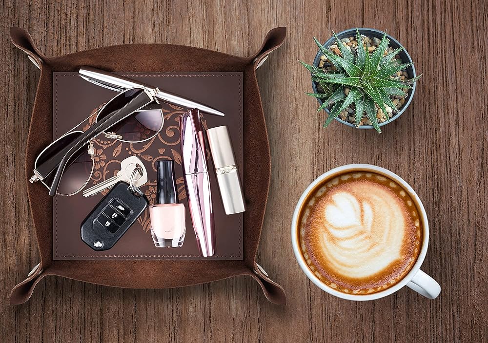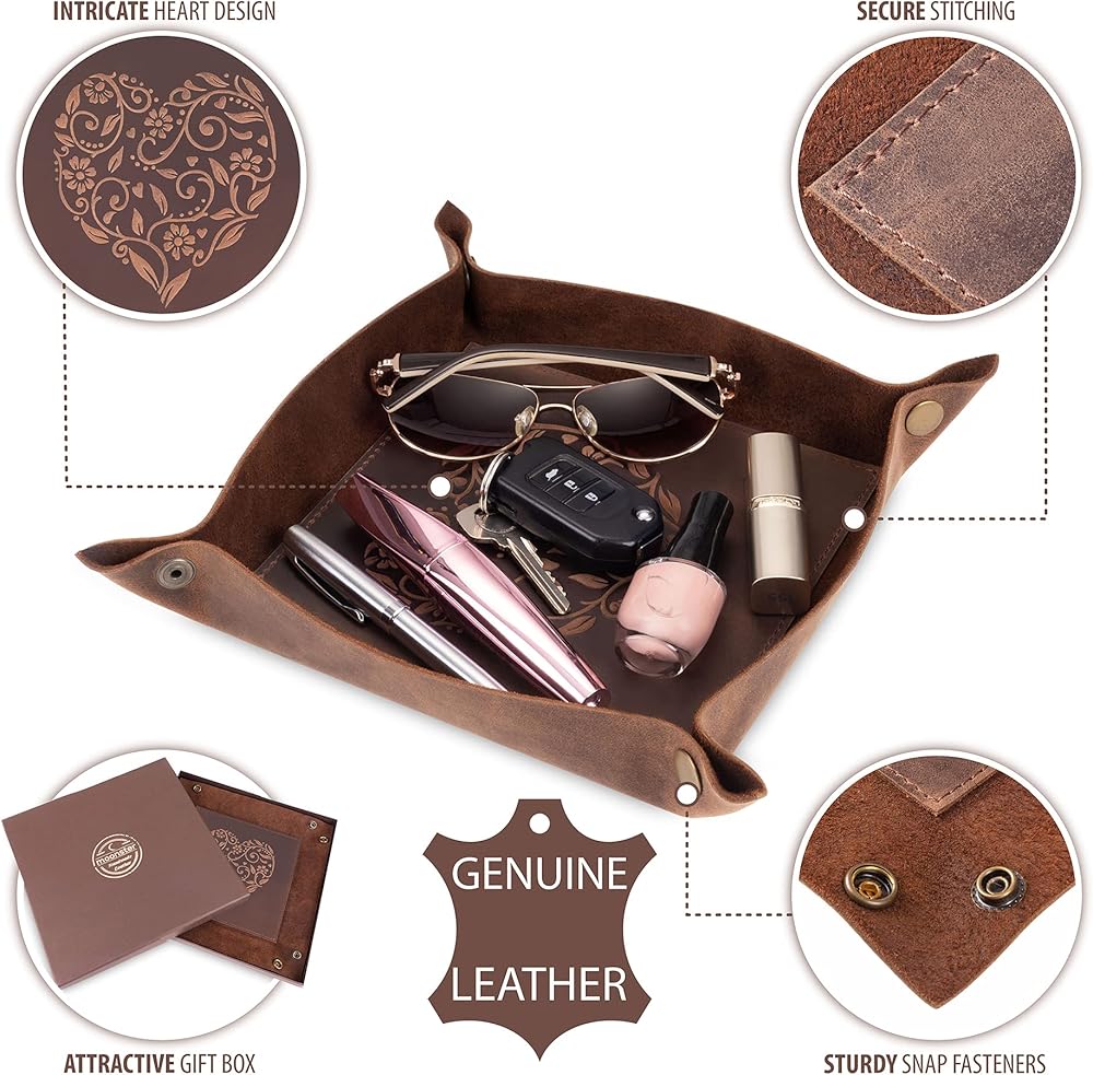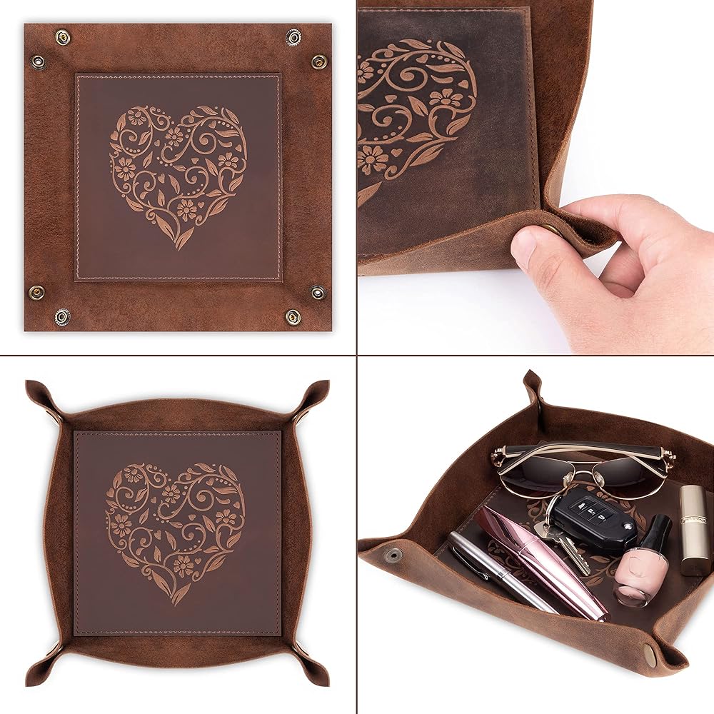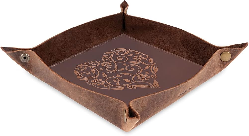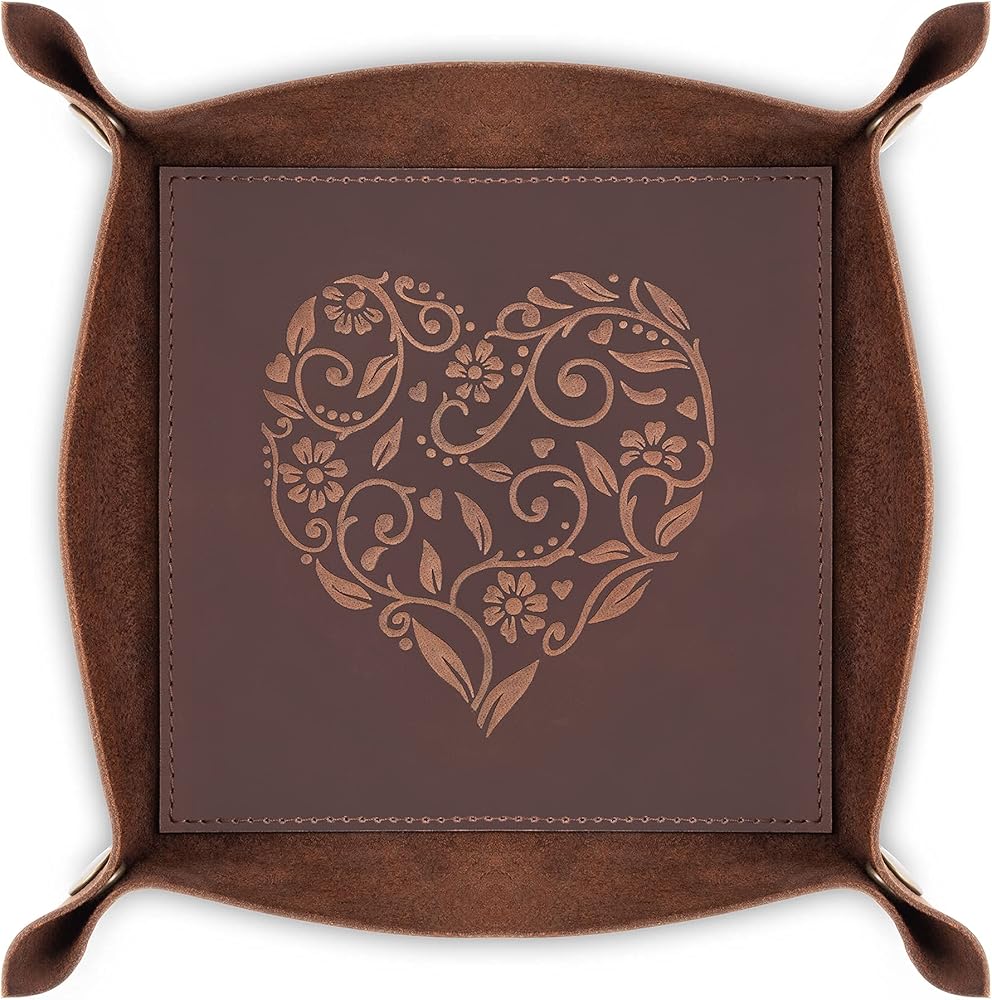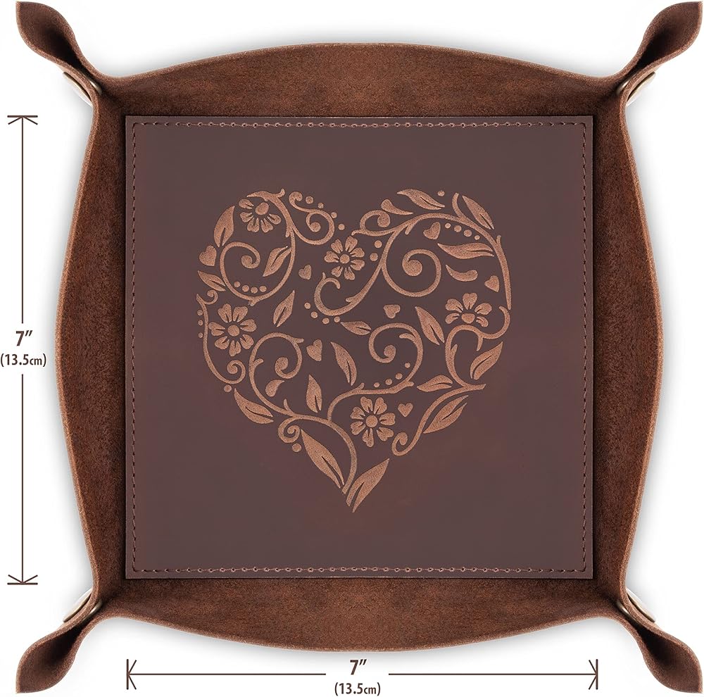 ★ فريد من نوعه، يتميز حامل الساعة والحمل اليومي الخاص بنا بنقوش قلب معقدة لن تجدها في أي مكان آخر. مصنوعة بعناية واهتمام بالتفاصيل، صينية النساء والرجال الخاصة بنا هي الإضافة المثالية والعملية لأي غرفة. ومع صندوق هدايا بني جذاب، فإنه يمثل هدية رائعة.