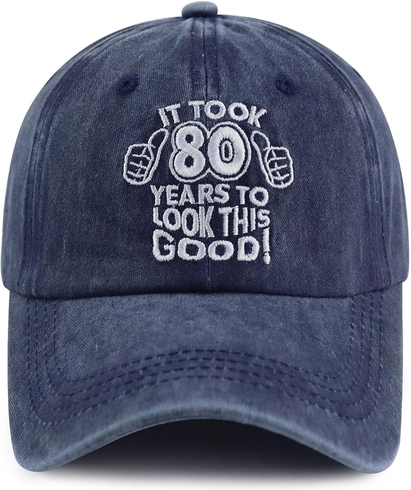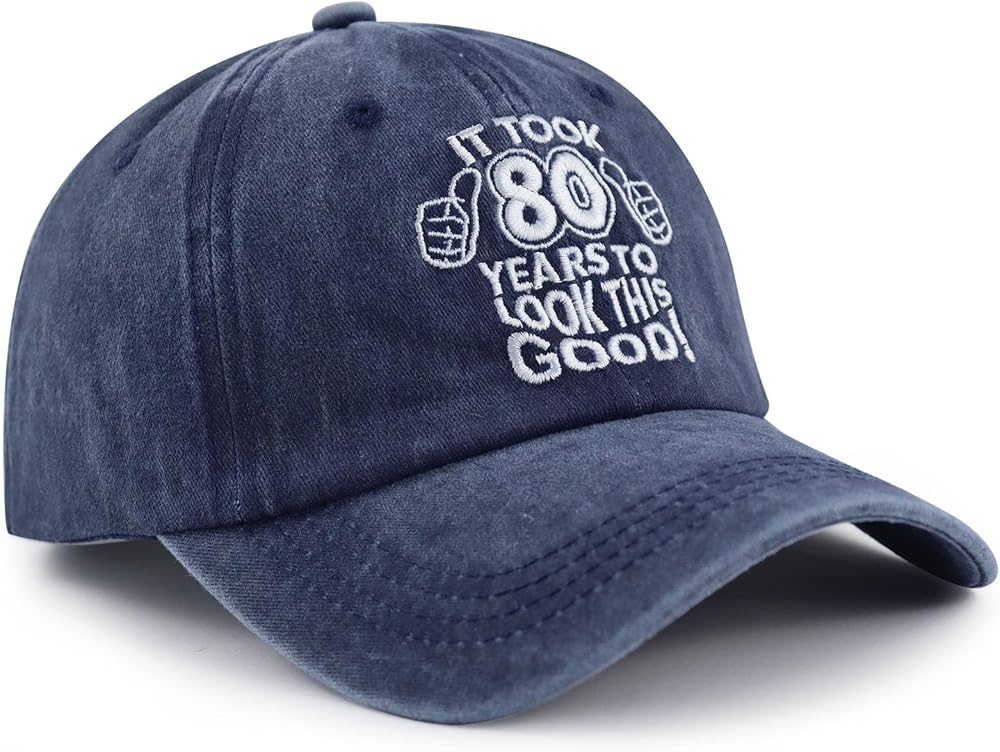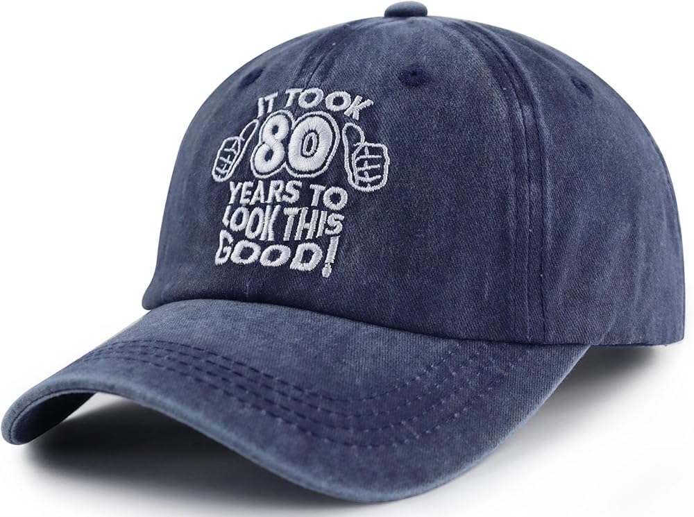 قبعات هدايا التقاعد المخصصة: لوازم حفلات عيد الميلاد الثمانين، قبعات الأب المتعثرة المصنوعة من الجينز العتيق مصنوعة من نسيج قطني غير منظم عالي الجودة ولها 6 فتحات ذكية في الأعلى، تزيد من نفاذية القبعة، مما يضمن أنك تستمتع بالدفء والتنفس في كل مرة، مريحة ارتداء طوال اليوم.