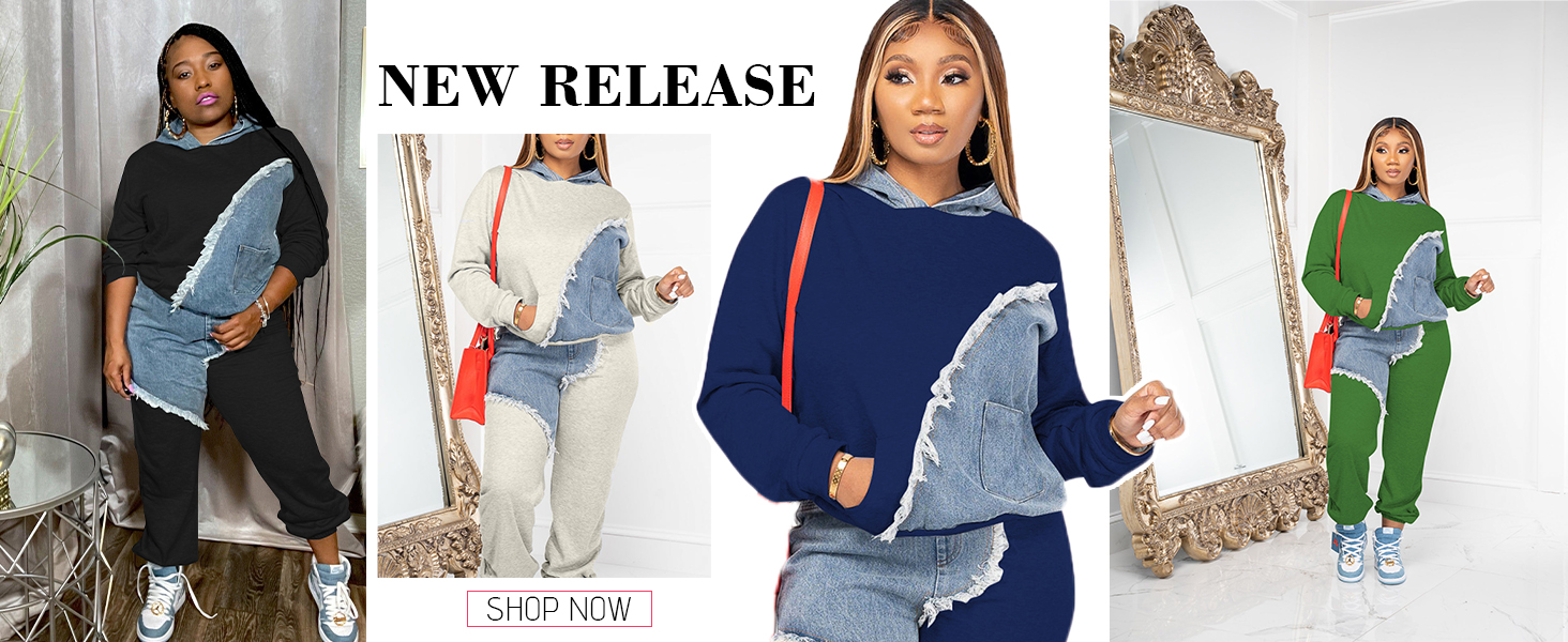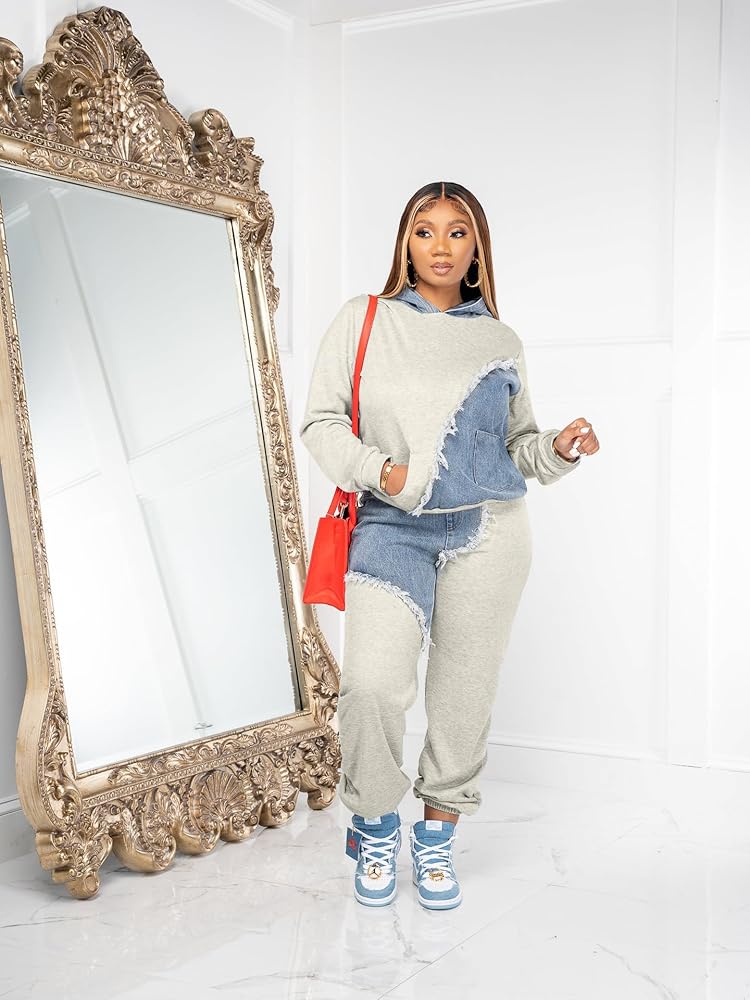 • التصميم: طقم بدلة رياضية كاجوال من قطعتين للنساء مصمم بألوان بسيطة، مرقعة من الجينز، أكمام طويلة، هودي وجيوب، والتي لن تنتهي موضتها أبدًا.