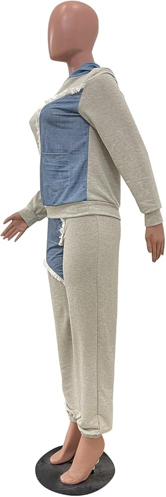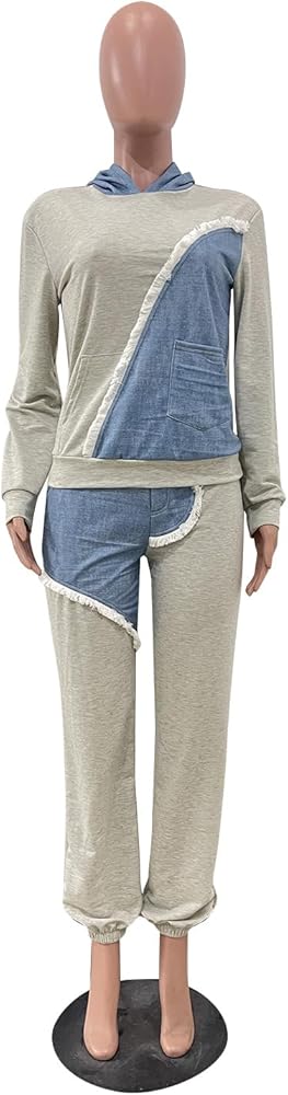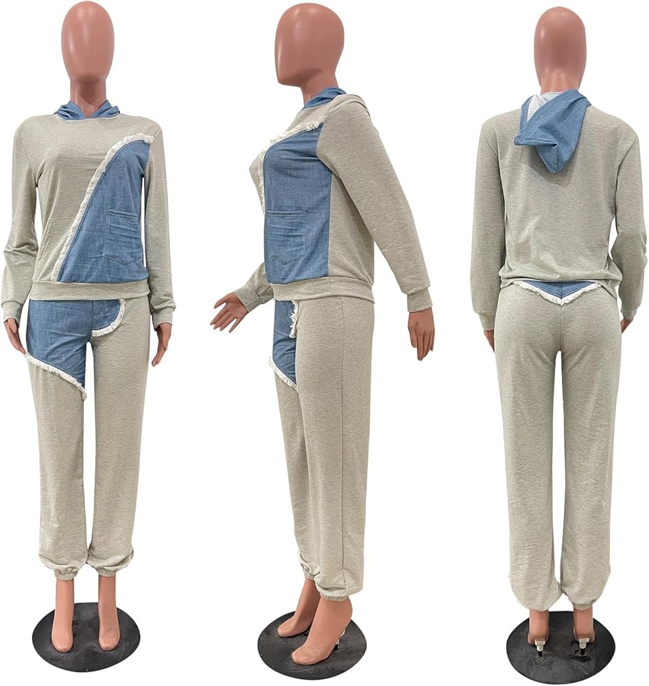 بدلة رياضية كاجوال للنساء من قطعتين من الدنيم بالوان متباينة وأكمام طويلة وبنطلون بغطاء للرأس وجيوب