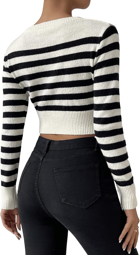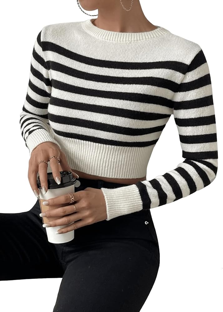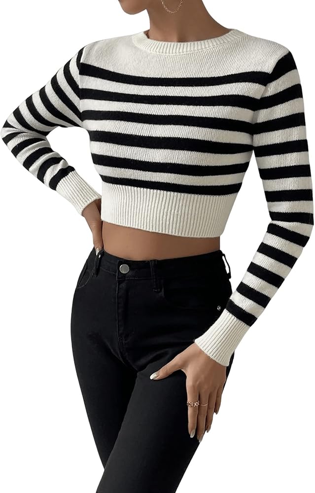 قميص سويتي روكس نسائي مخطط بأكمام طويلة ومضلع ومقاس نحيف، بلوفر قصير