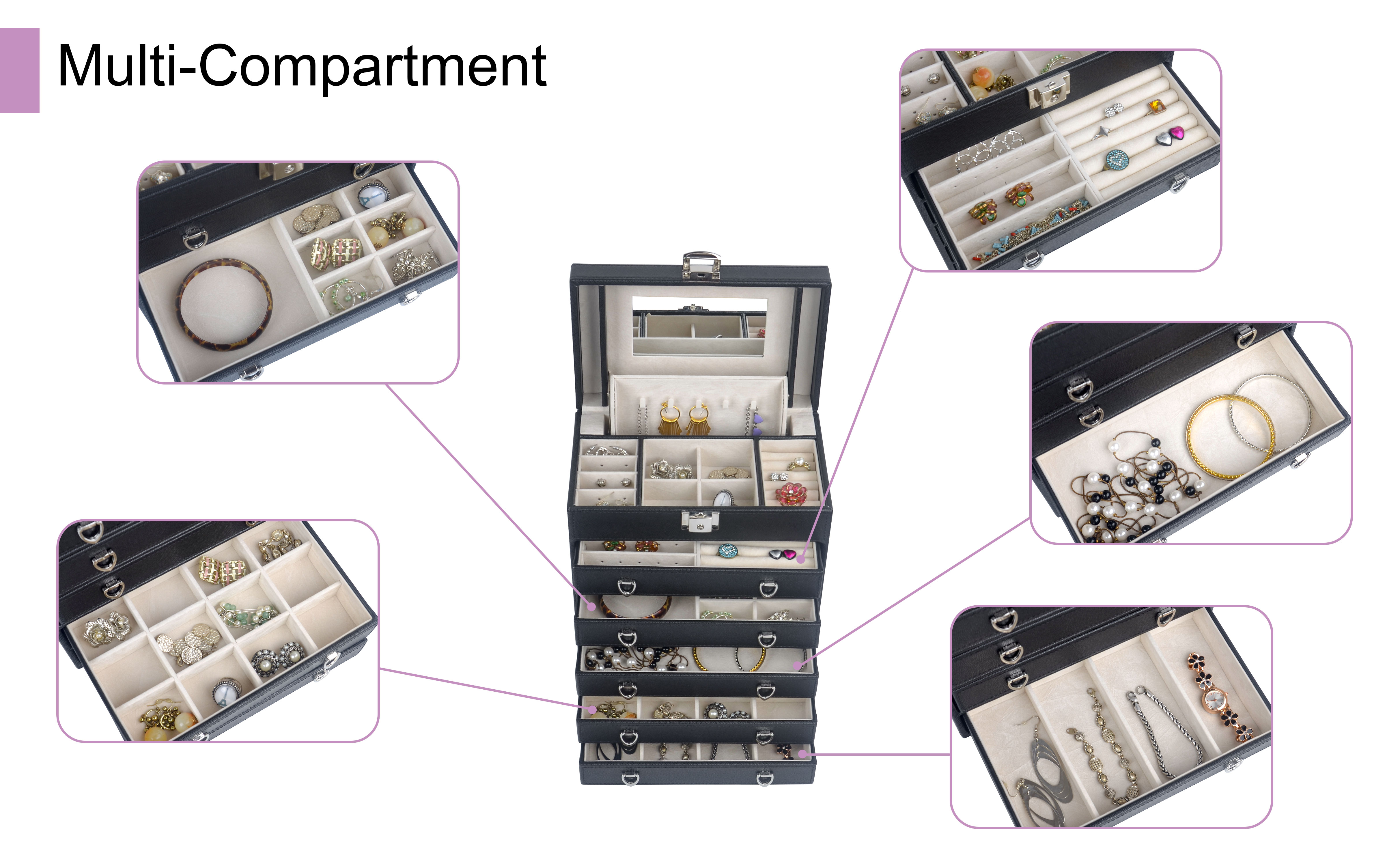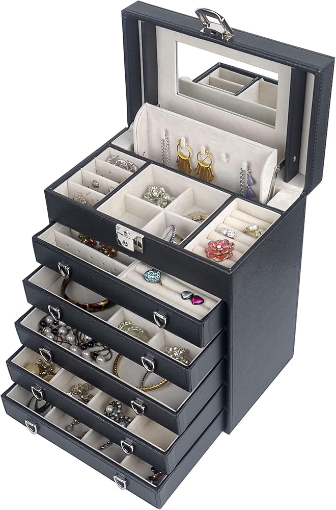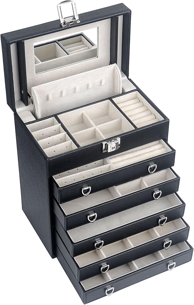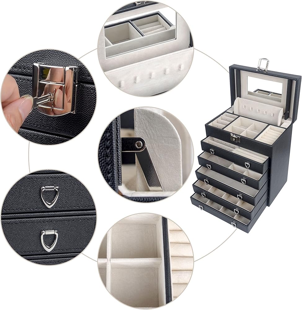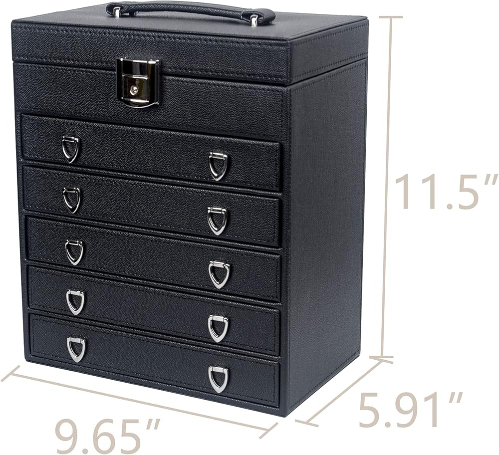 صندوق مجوهرات مكون من 6 طبقات مع 5 أدراج قابلة للإزالة لأقصى مساحة لتخزين المجوهرات. كل من الدرج له نفس الحجم، مع مساحة تخزين مختلفة، مما يساعد على الحفاظ على نمط مختلف من المجوهرات.