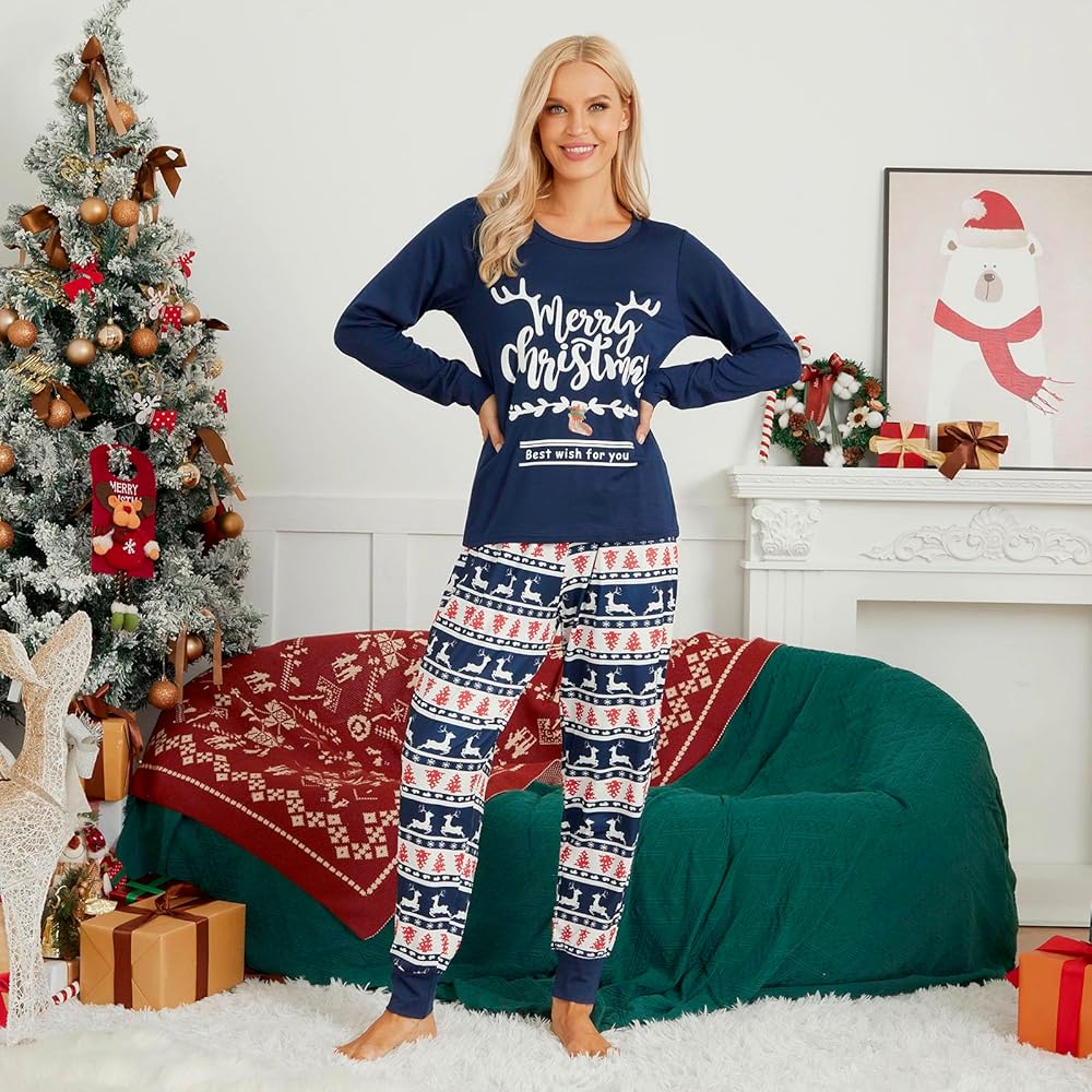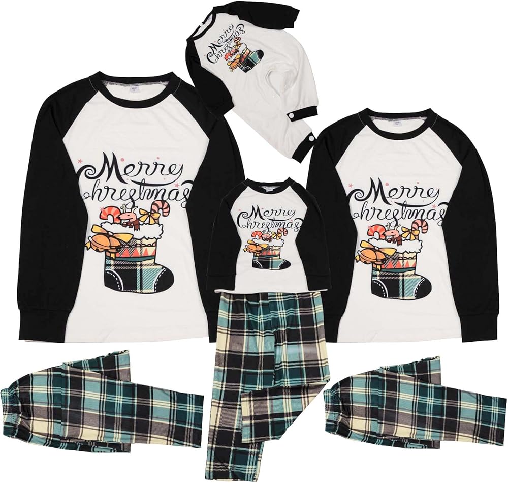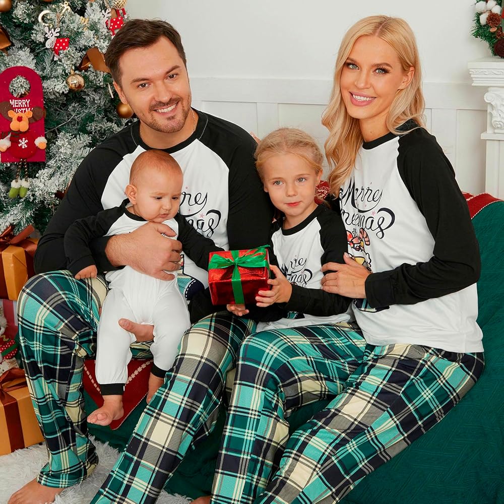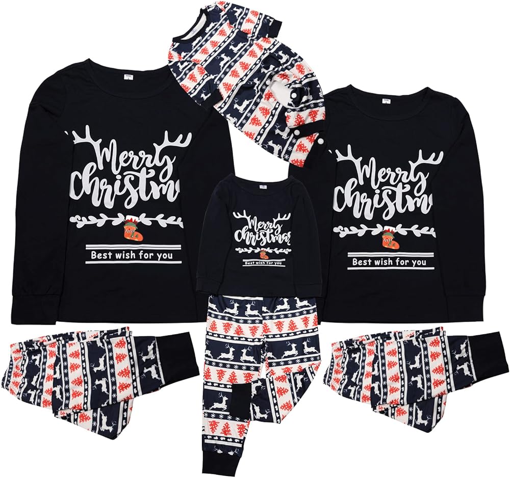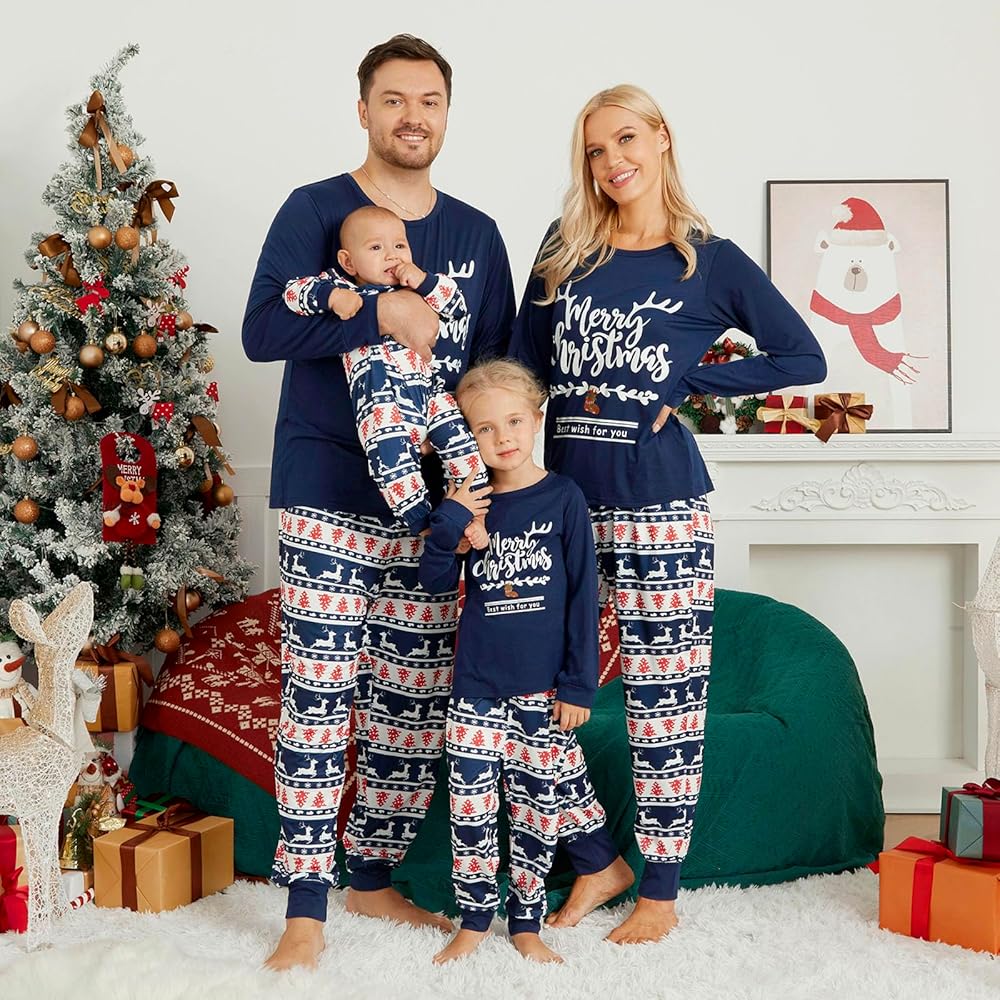 تشتمل مجموعات بيجامات عيد الميلاد العائلية المطابقة على قمصان بيجامات بأكمام طويلة وقمصان وسراويل سفلية مع حروف "Merry Christmas"، وجوارب عيد الميلاد، وأشجار عيد الميلاد، وحيوانات الرنة، مثالية لاحتفالات عطلة عيد الميلاد.