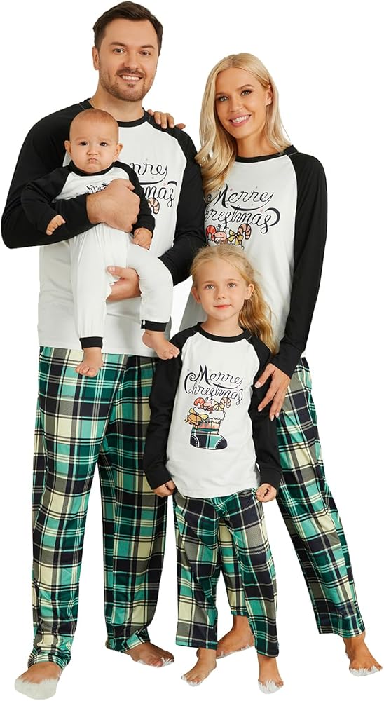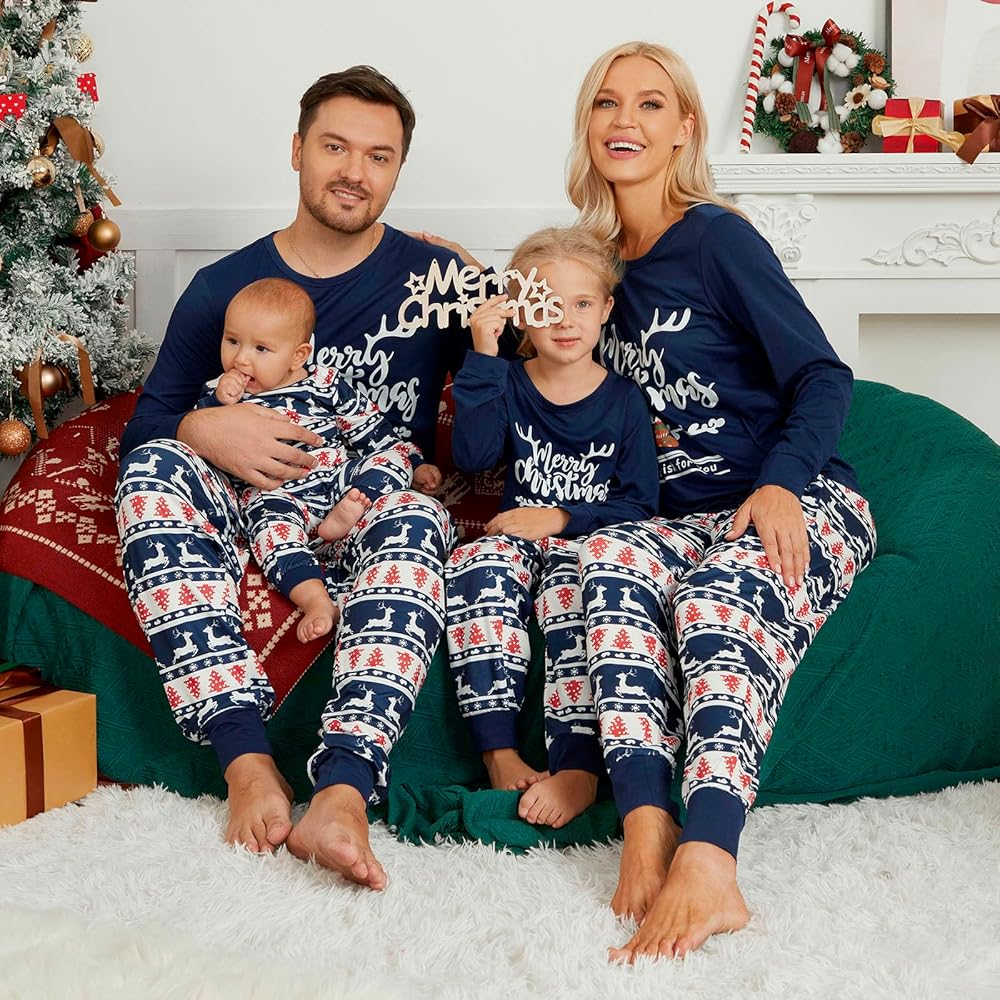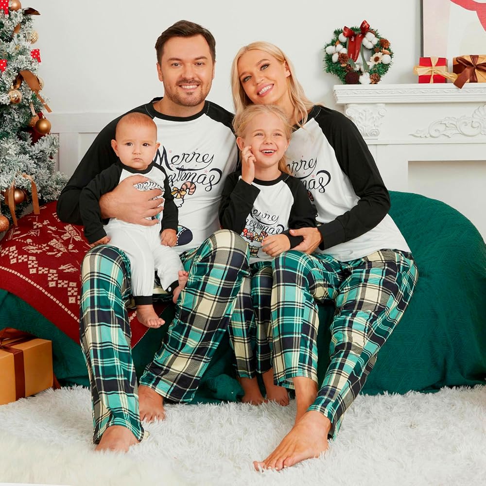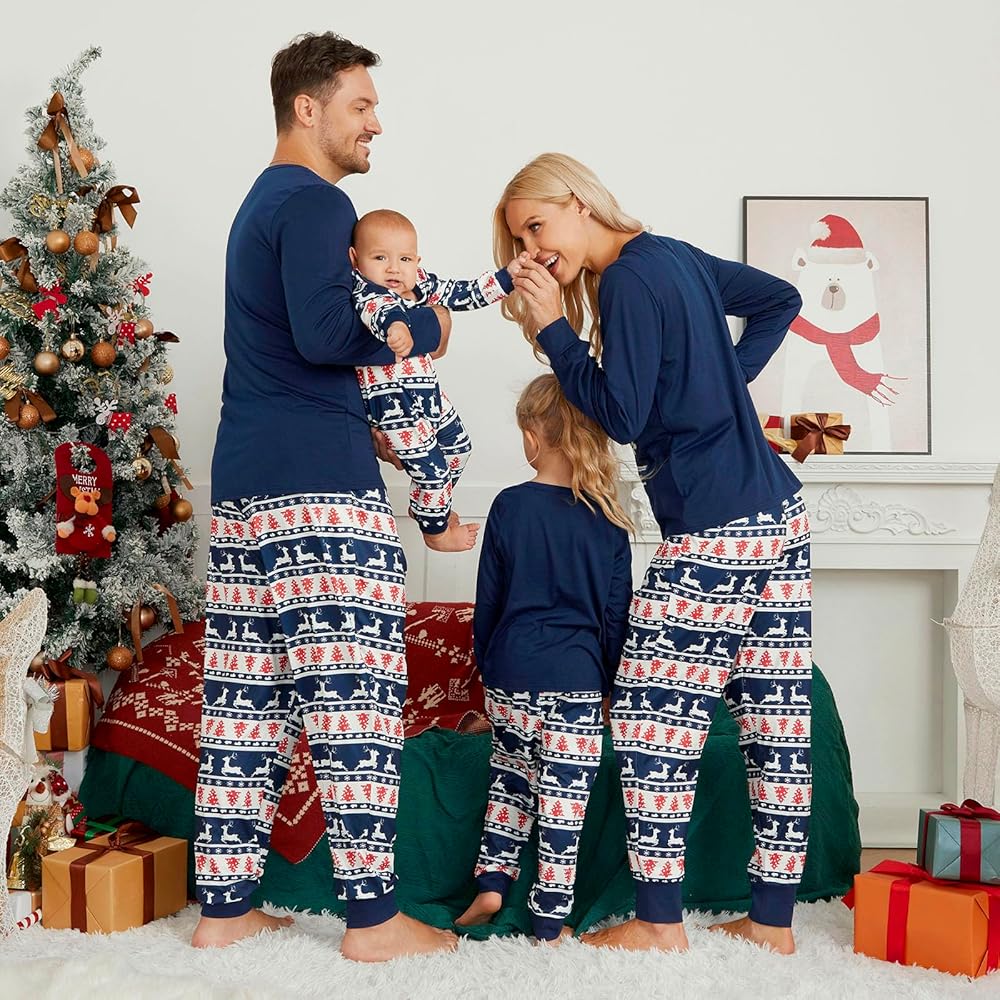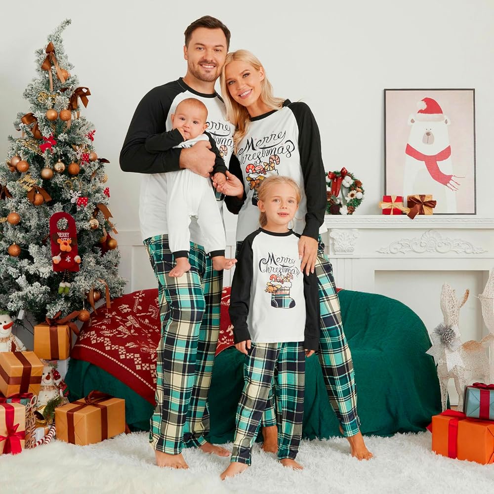 تشتمل مجموعات بيجامات عيد الميلاد العائلية المطابقة على قمصان بيجامات بأكمام طويلة وقمصان وسراويل سفلية مع حروف "Merry Christmas"، وجوارب عيد الميلاد، وأشجار عيد الميلاد، وحيوانات الرنة، مثالية لاحتفالات عطلة عيد الميلاد.
