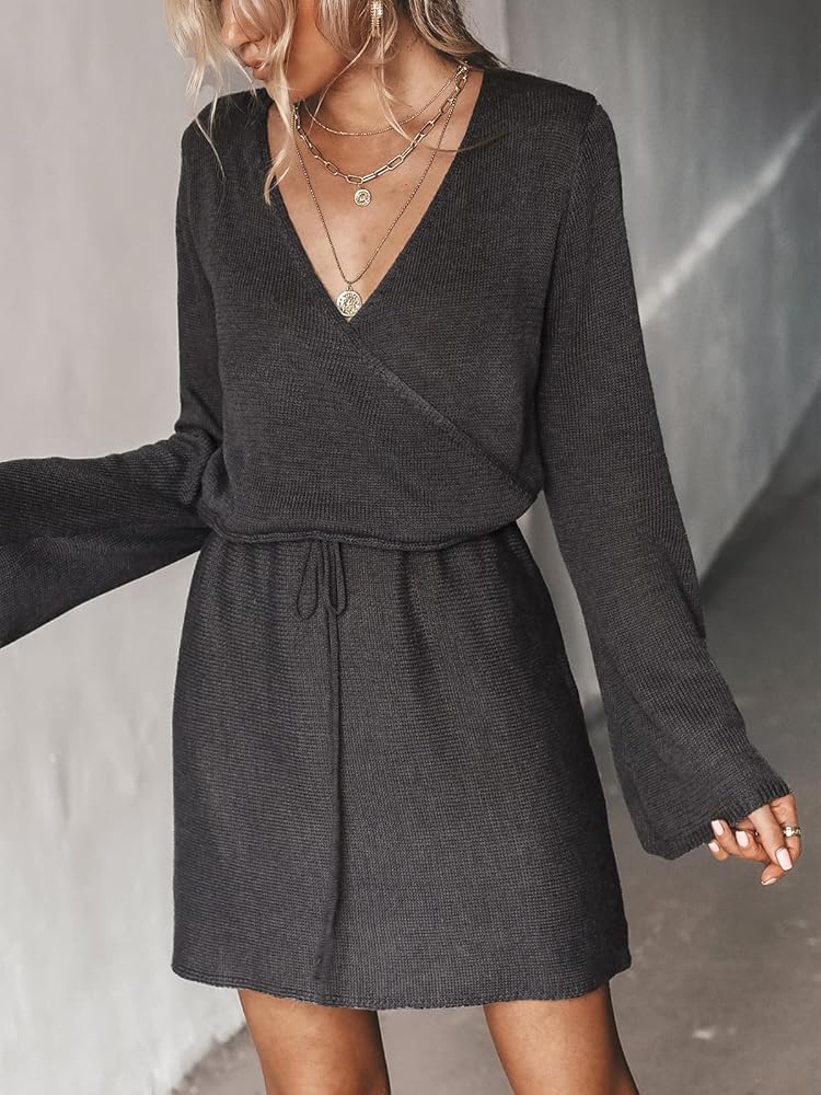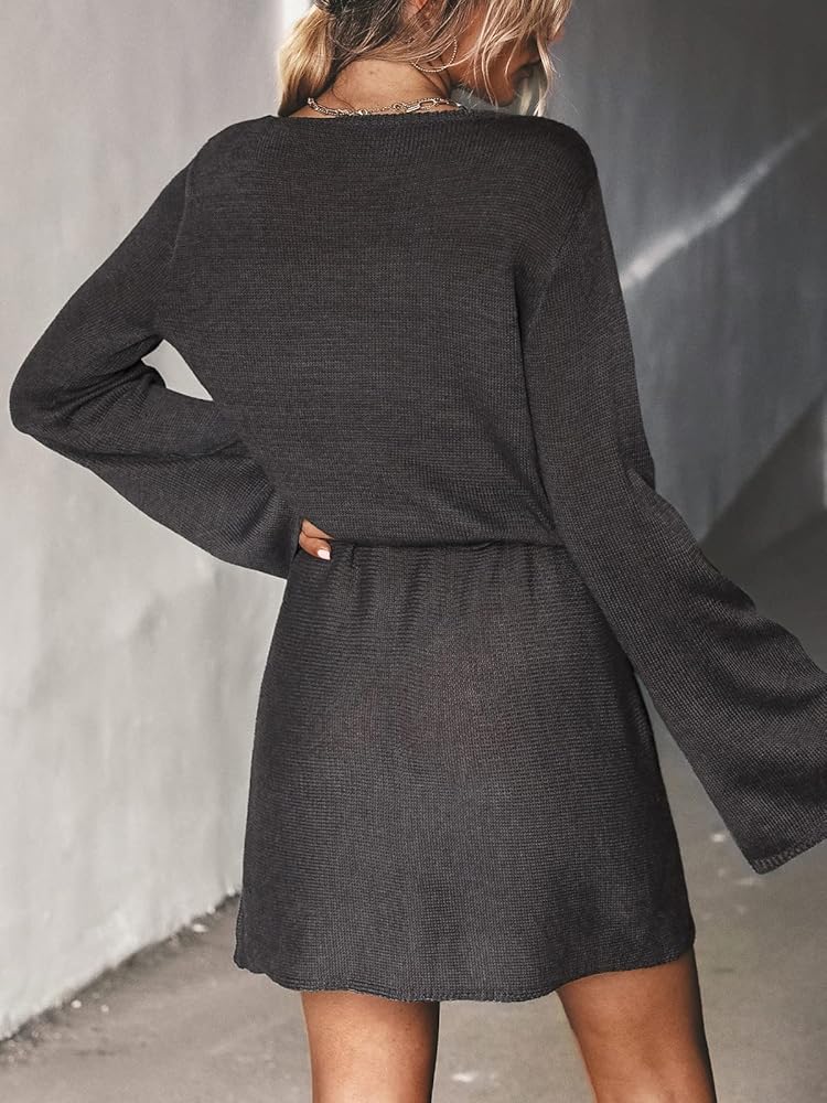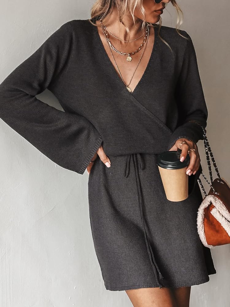 • [تصميم فريد]: ارفع ملابسك المحبوكة مع هذا الفستان الذي يتميز بخط رقبة على شكل حرف V، وخصر برباط، وأكمام طويلة واسعة، وزخرفة مضلعة، وحاشية صغيرة.