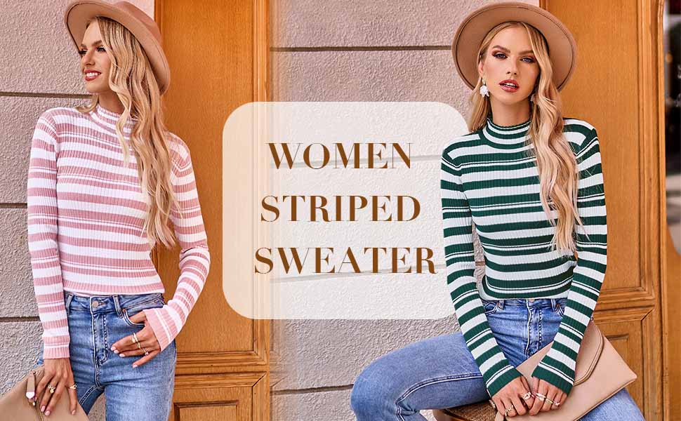 سترة نسائية من ABYOXI بمقاس نحيف بياقة مدورة وأكمام طويلة وخفيفة الوزن ومتماسكة ومضلعة كاجوال سترة مخططة
